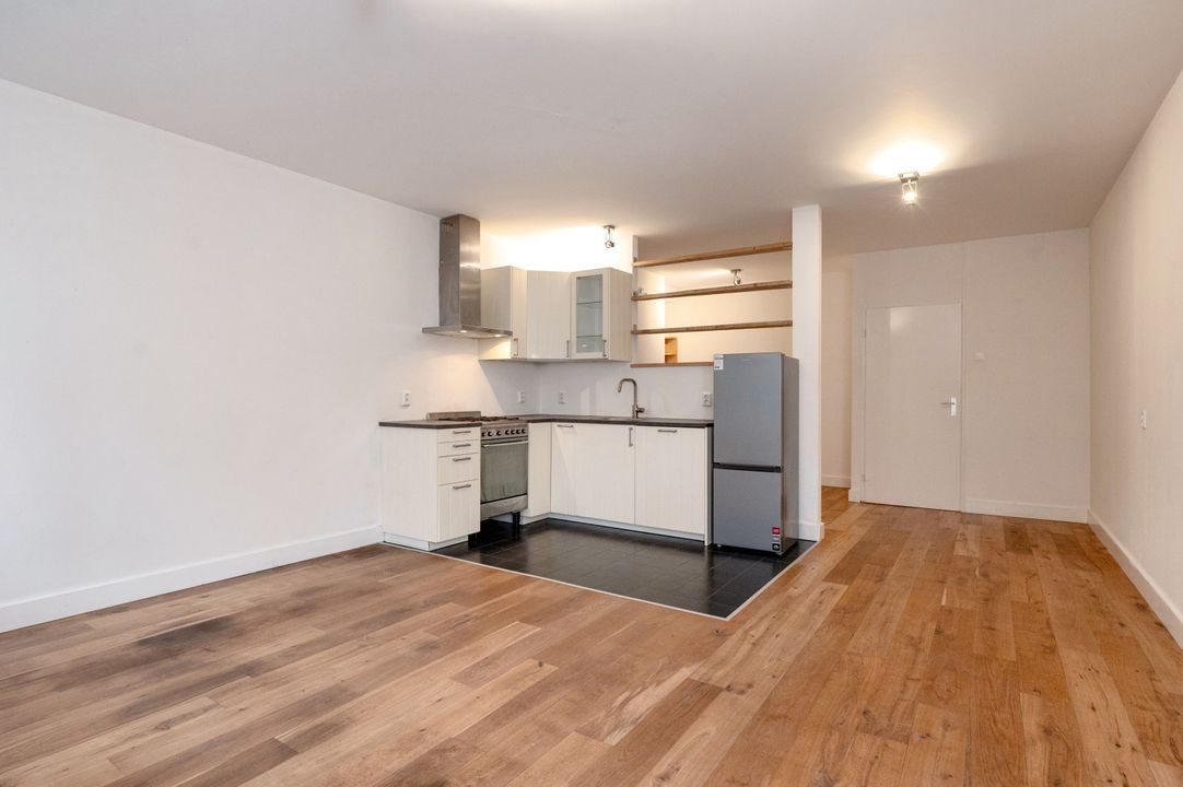 Gesloten gemeenschappelijke entree met bellen- en brievenbussenpaneel ; entree appartement met ruime hal met meterkast en toegangsdeur naar moderne badkamer met douche, vaste wastafel met meubel,toilet en aansluitingen was apparatuur. Royale living/dining met parketvloeren en moderne geintegreerde open keuken met diverse (inbouw) apparatuur te weten een 4 pits gaskookplaat, oven, rvs-wasemkap, vaatwasmachine en koelvriescombinatie.