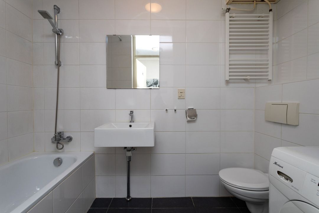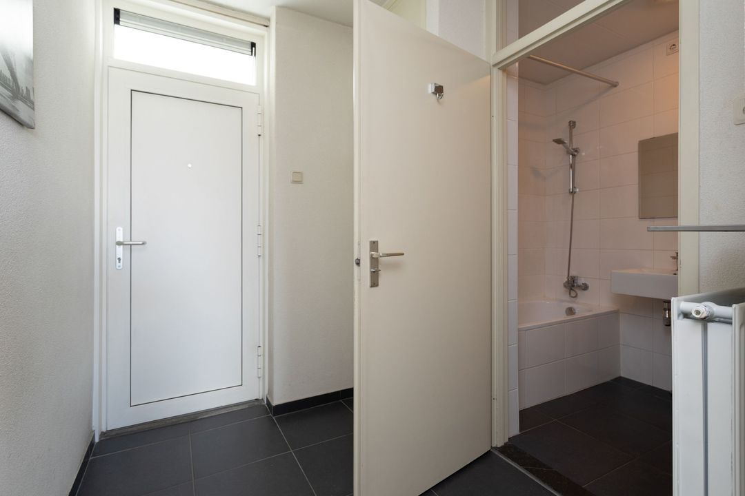 Gezamenlijke entree met video-systeem ; Lift en trappenhuis naar de 4e etage ; entree appartement ; hal met intercom,meterkast en toegangsdeur naar moderne badkamer met ligbad , douche , vaste wastafel , toilet en aansluiting wasmachine.