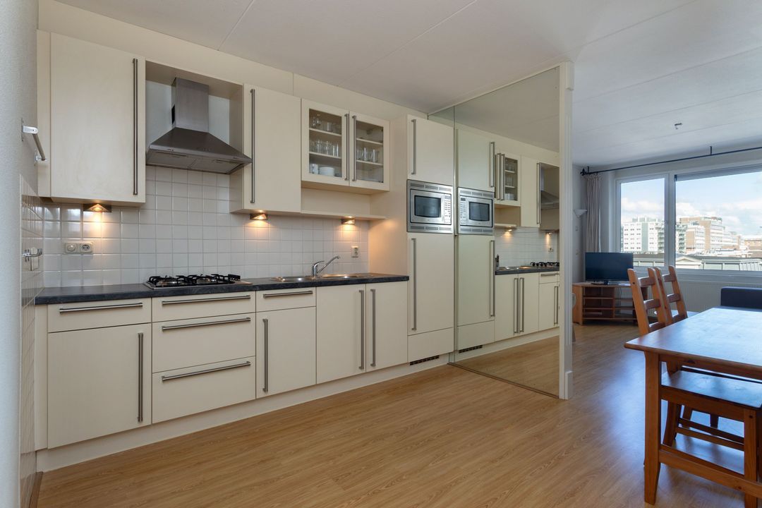 Living/dining met geïntegreerde open keuken met diverse inbouwapparatuur ; studeerhoek met toegangsdeur naar het balkon ; slaapkamer met fraaie schuifspiegelkastenwand.