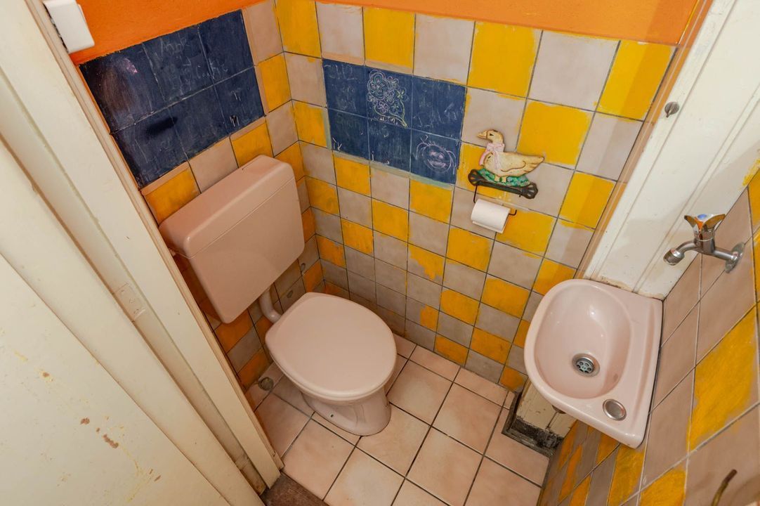 Layout: front garden with bicycle storage, entrance, hall/cloakroom with meter cupboard and draft door, hallway with stair cupboard, toilet with washbasin, living/dining room with suite separation and parquet flooring, semi-open kitchen, double doors to the back garden (South-West).