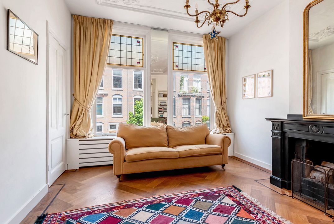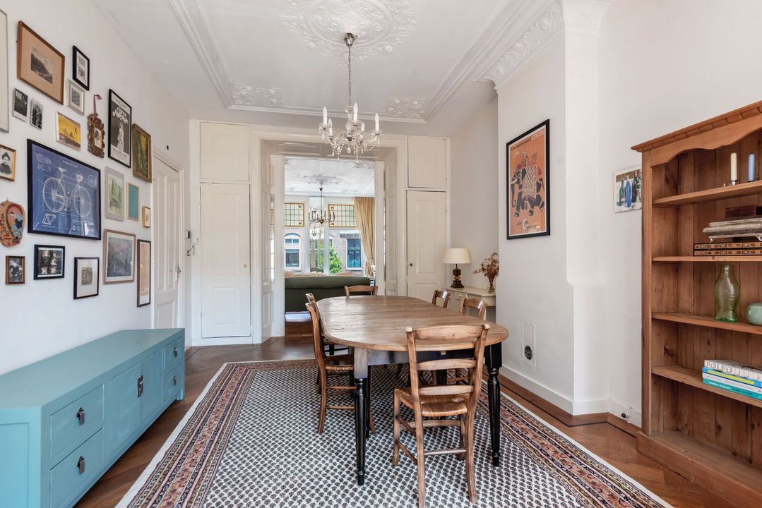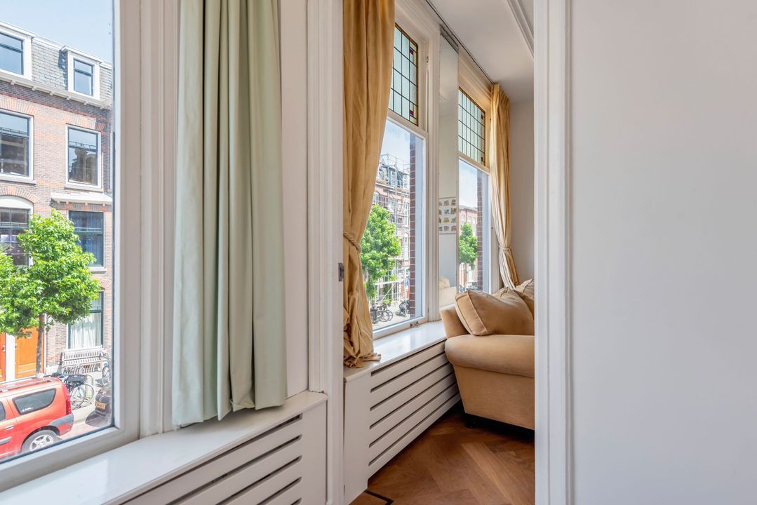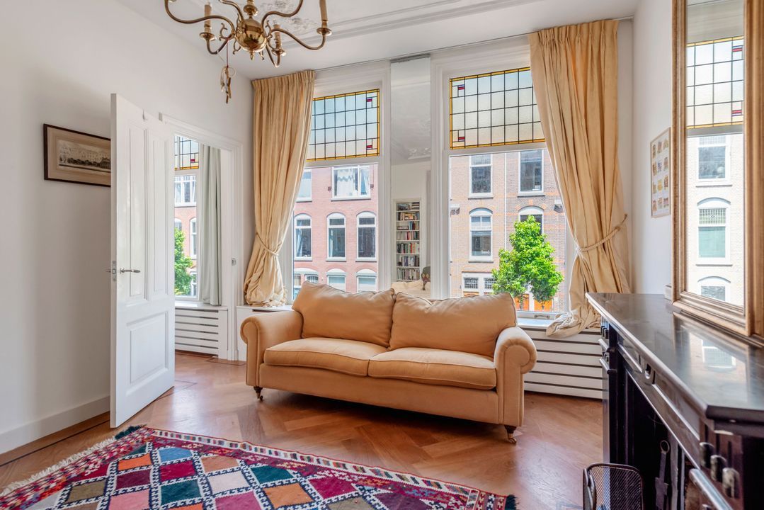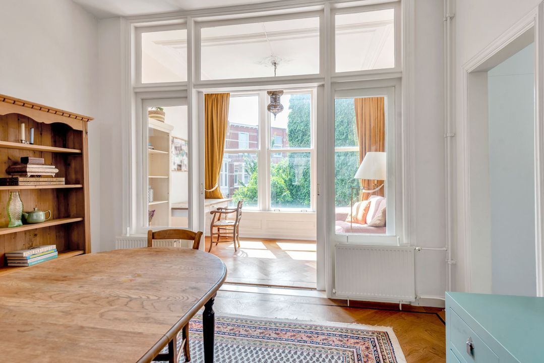 Indeling: gemeenschappelijke entree, trap naar de eerste verdieping overloop met entree appartement, woon-/eetkamer ensuite v.v. ornamenten plafonds, glas in lood ramen, marmeren schouw met open haard, suite separatie met kasten, serre met oorspronkelijke separatie, moderne keuken voorzien inbouwapparatuur (w.o. afwasmachine, oven, ijskast, keramische kookplaat) en toegang tot zonnig balkon (ZW/W), moderne badkamer v.v. inloop regendouche, zwevend toilet, wastafel en inbouwkast met opstelplaats voor wasmachine en droger, slaapkamer aan de voorzijde.