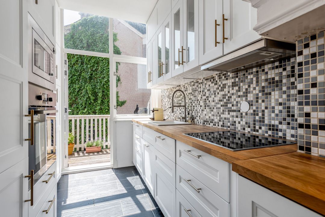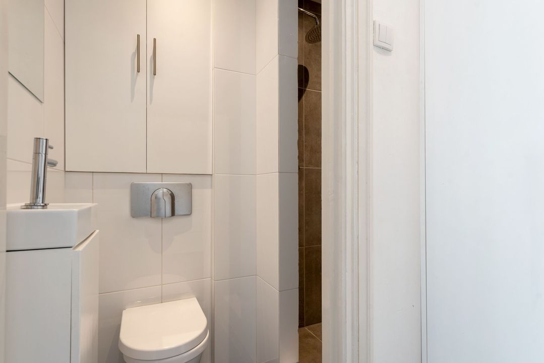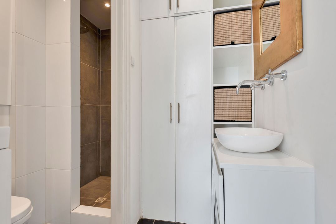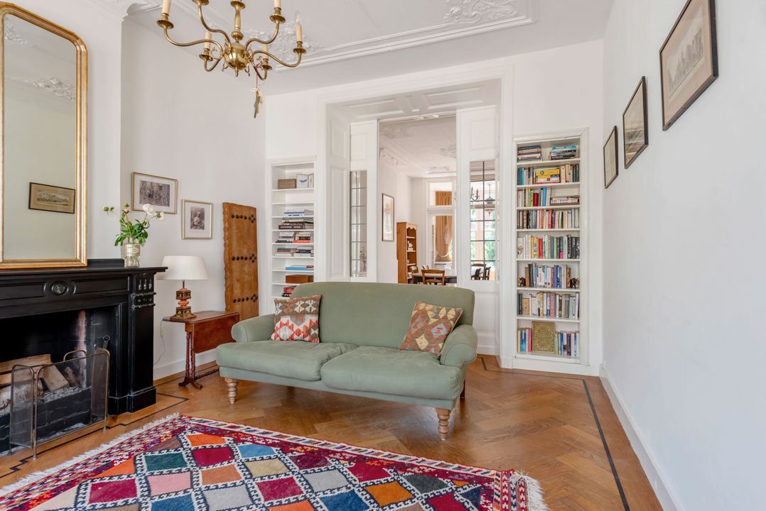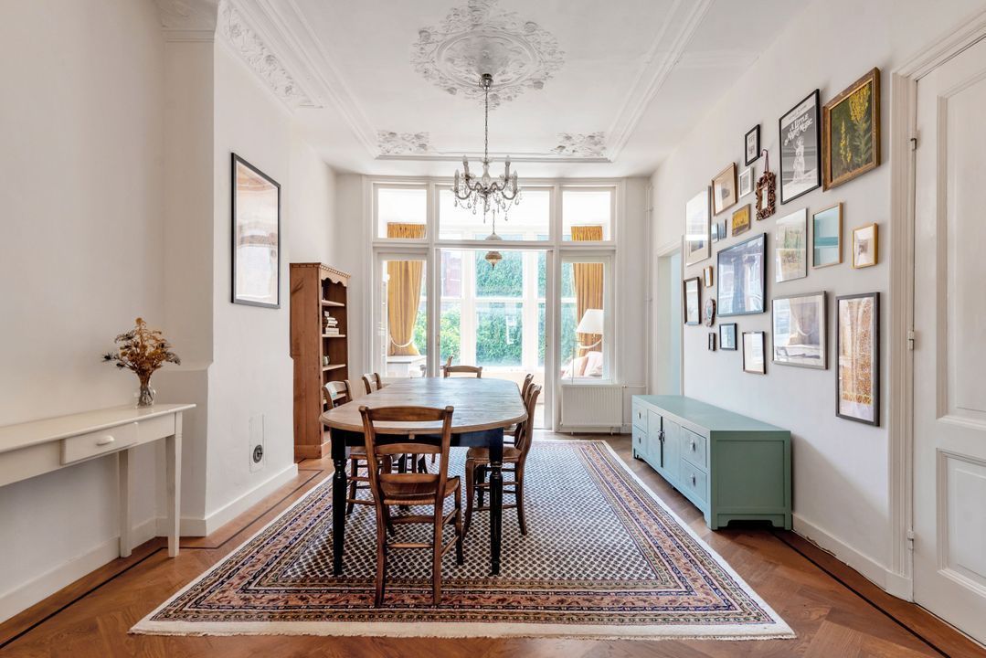 Indeling: gemeenschappelijke entree, trap naar de eerste verdieping overloop met entree appartement, woon-/eetkamer ensuite v.v. ornamenten plafonds, glas in lood ramen, marmeren schouw met open haard, suite separatie met kasten, serre met oorspronkelijke separatie, moderne keuken voorzien inbouwapparatuur (w.o. afwasmachine, oven, ijskast, keramische kookplaat) en toegang tot zonnig balkon (ZW/W), moderne badkamer v.v. inloop regendouche, zwevend toilet, wastafel en inbouwkast met opstelplaats voor wasmachine en droger, slaapkamer aan de voorzijde.