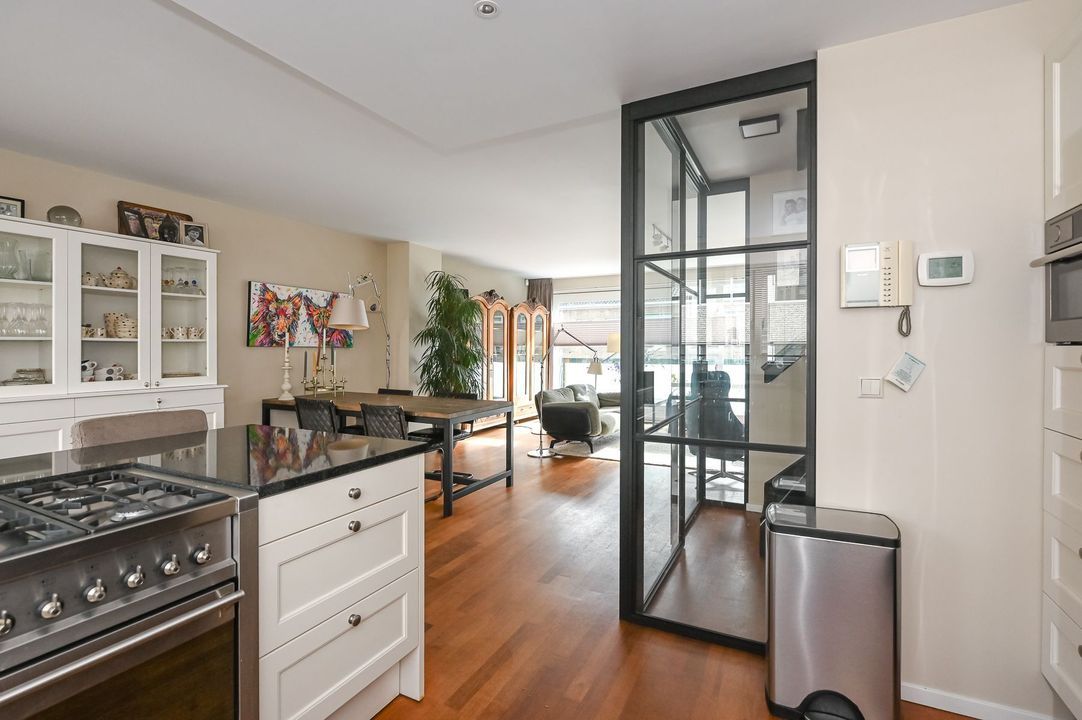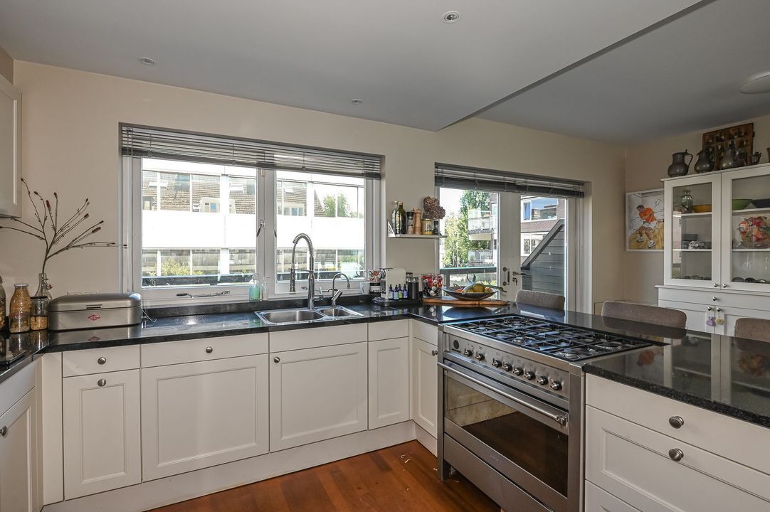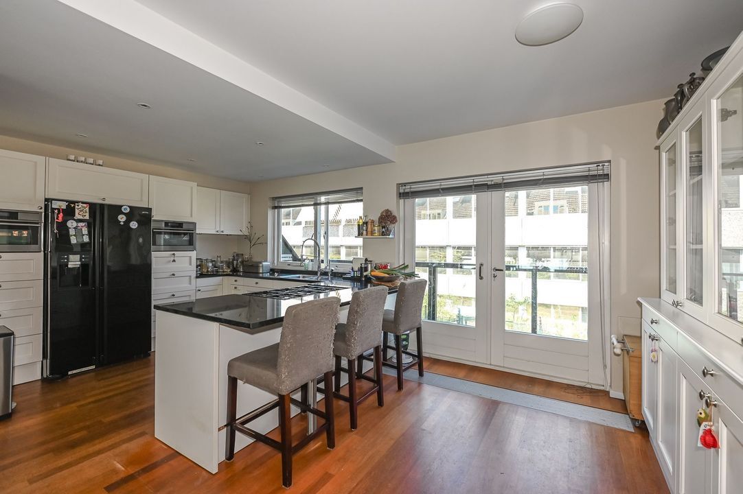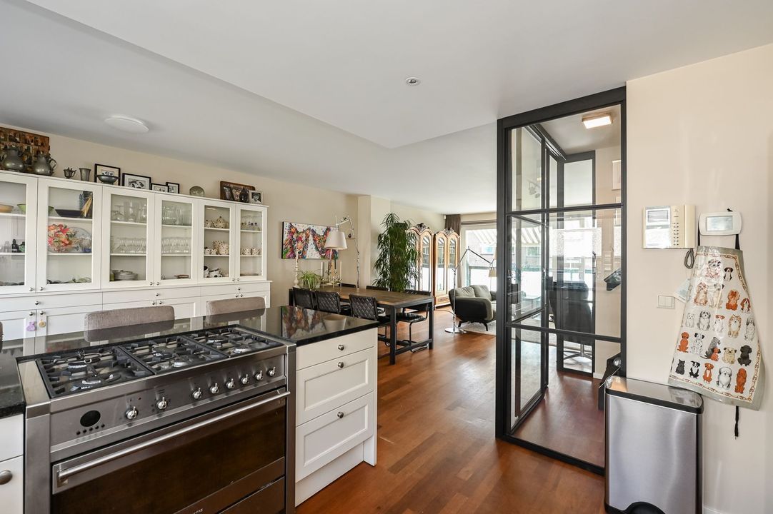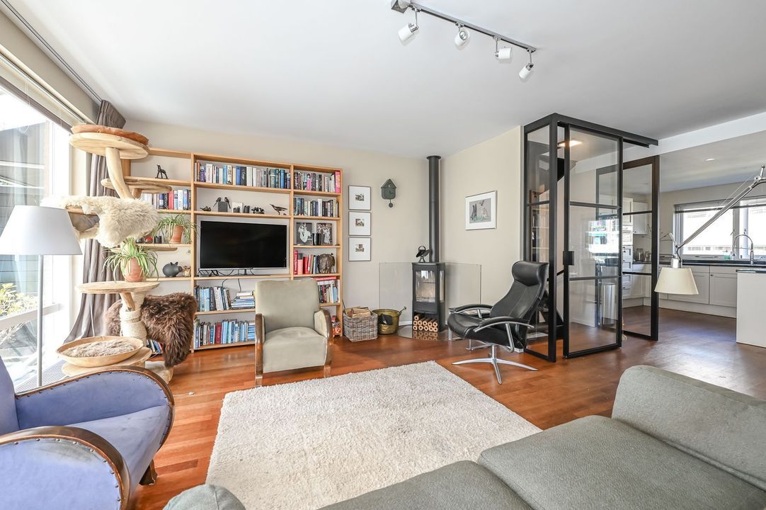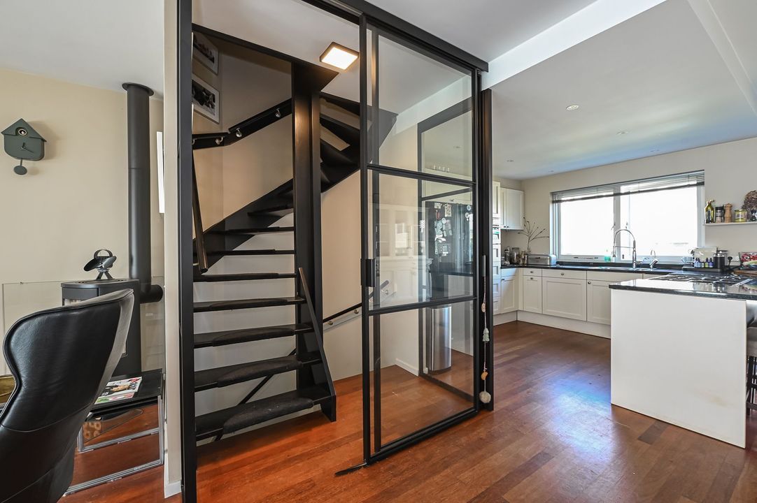 Trap naar woon gedeelte met ruime open keuken met dubbele deur naar achterbalkon, woongedeelte met parketvloer, nieuwe houtkachel en schuifpui naar ruim voor balkon.