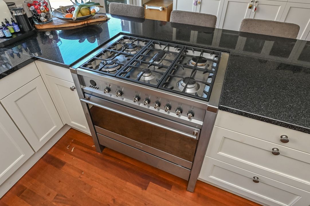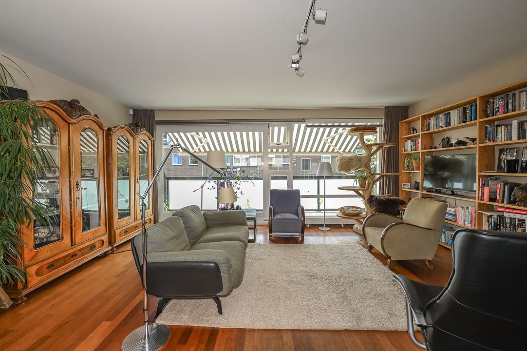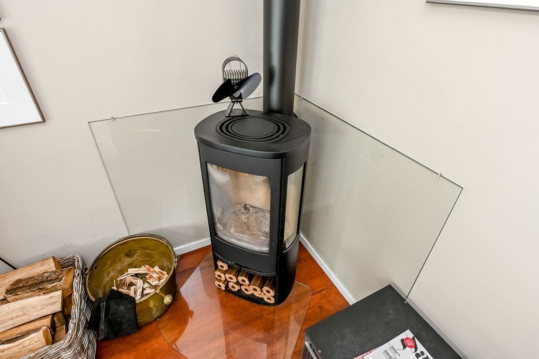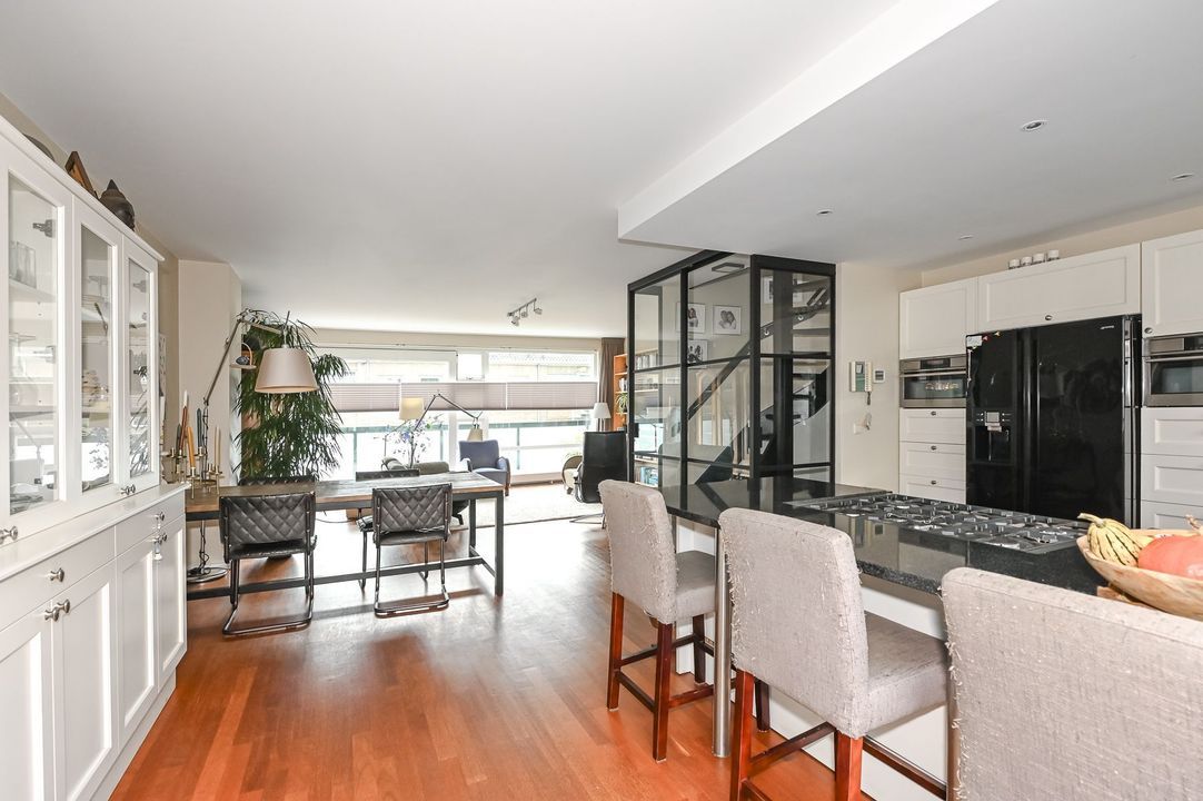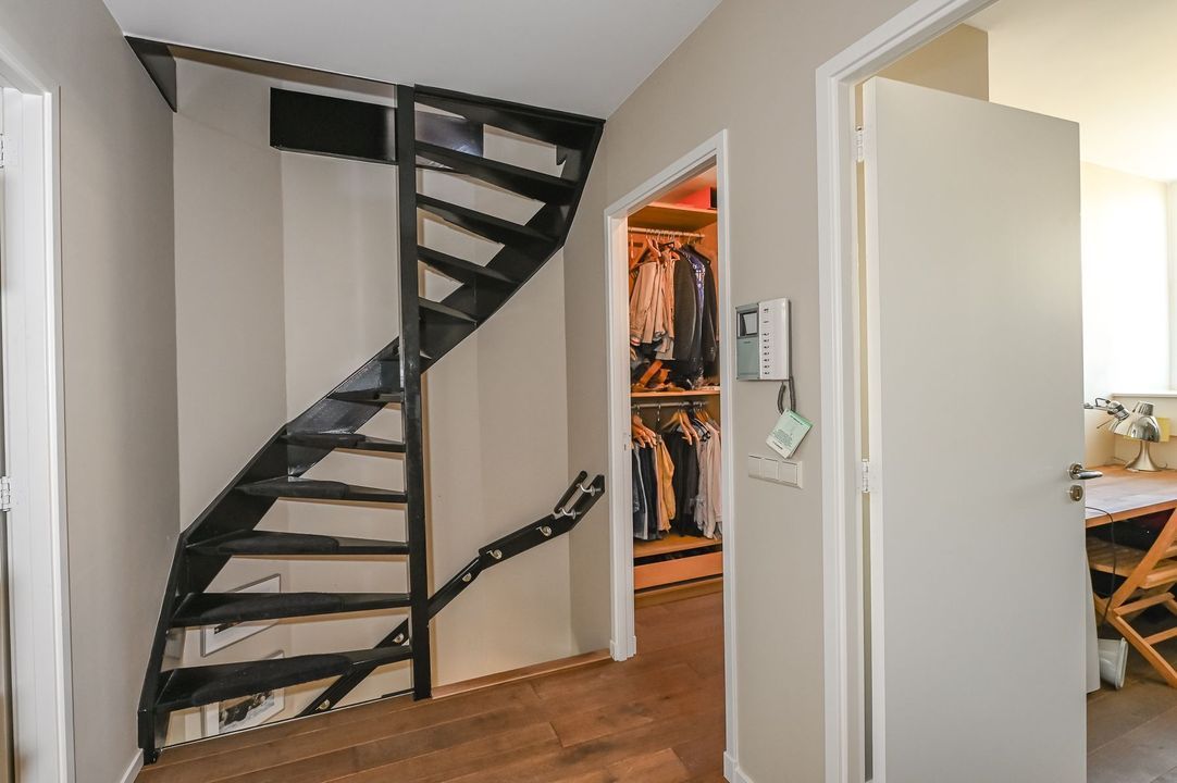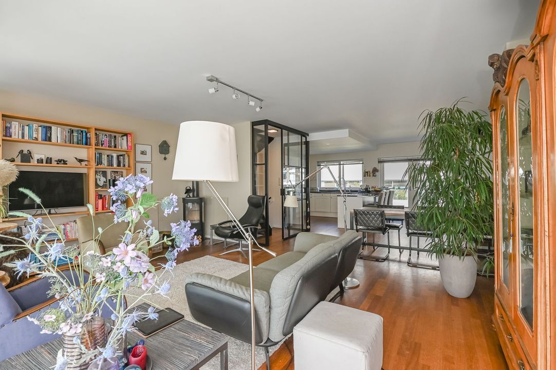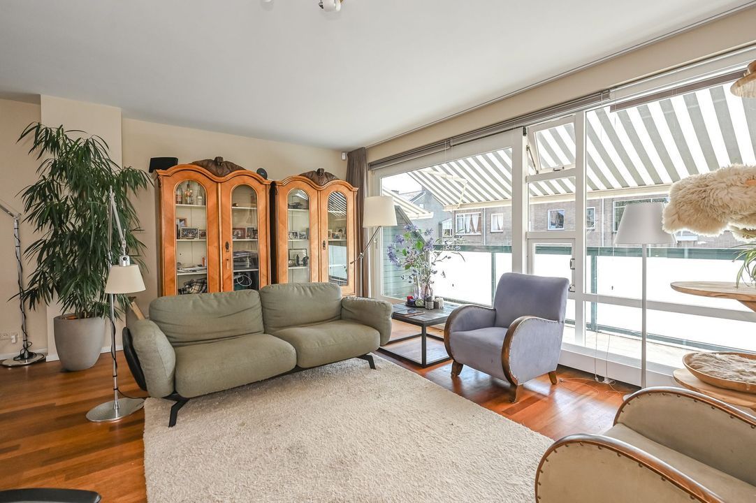 Trap naar woon gedeelte met ruime open keuken met dubbele deur naar achterbalkon, woongedeelte met parketvloer, nieuwe houtkachel en schuifpui naar ruim voor balkon.