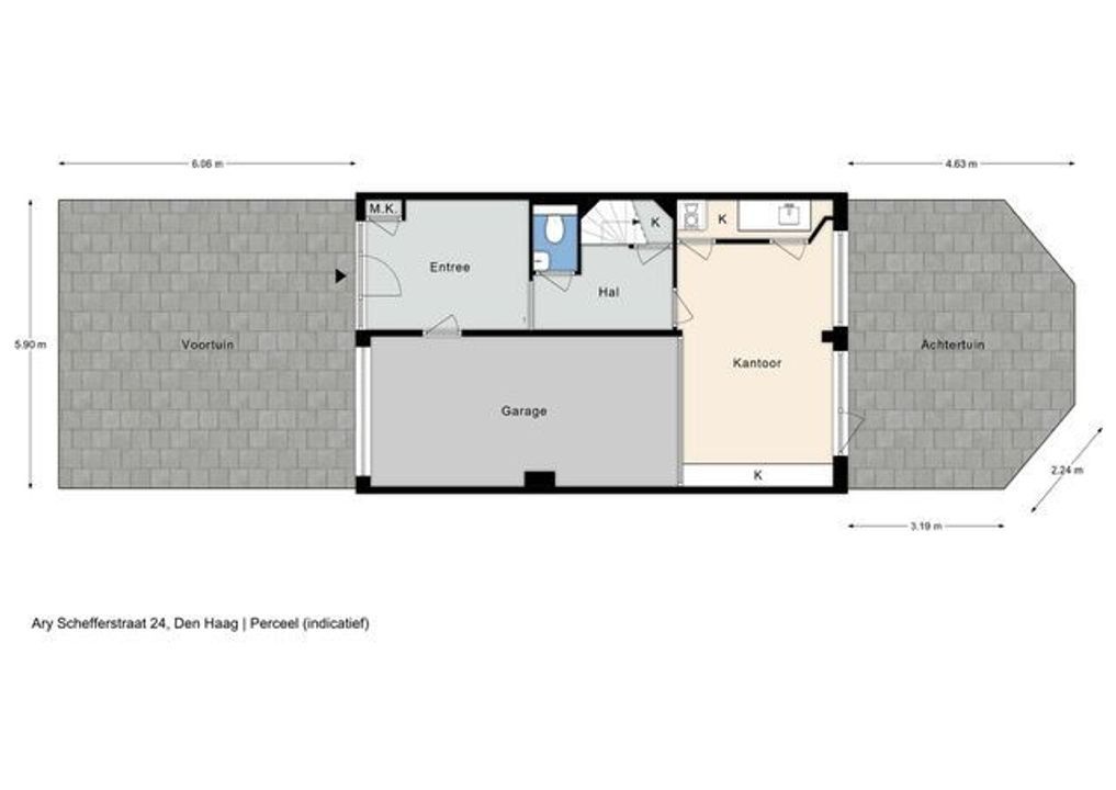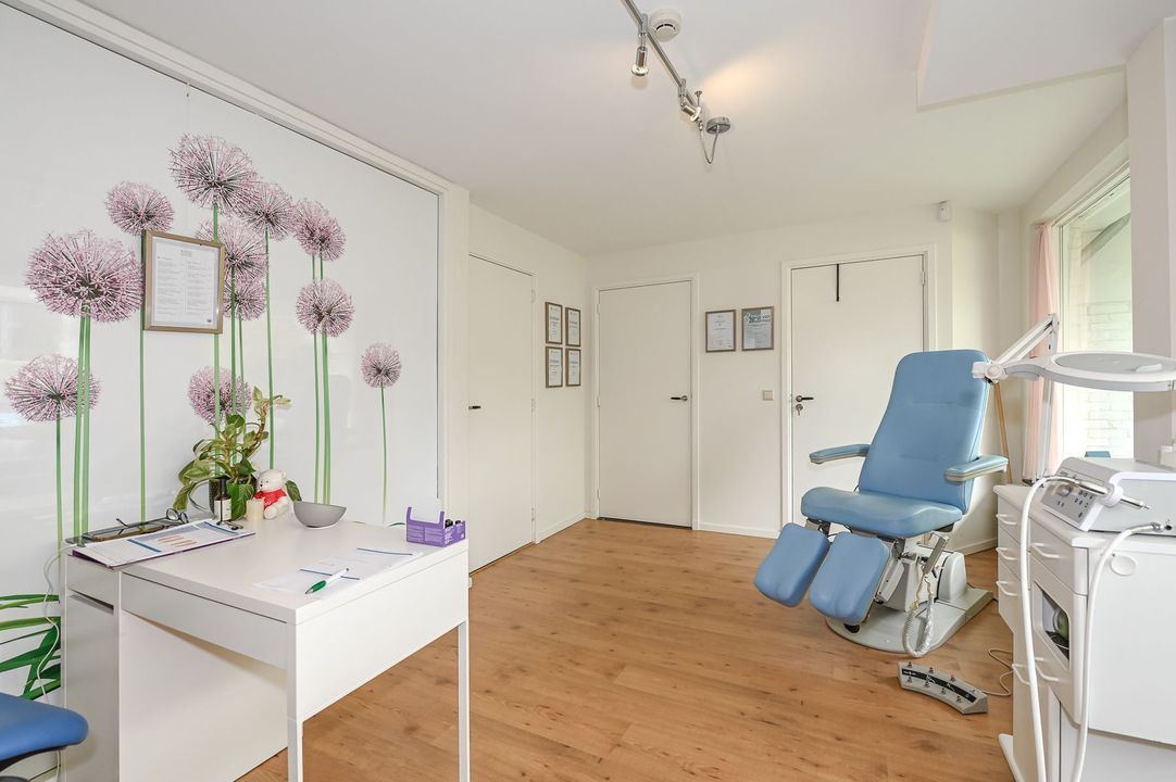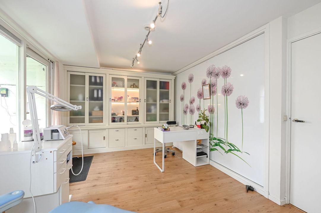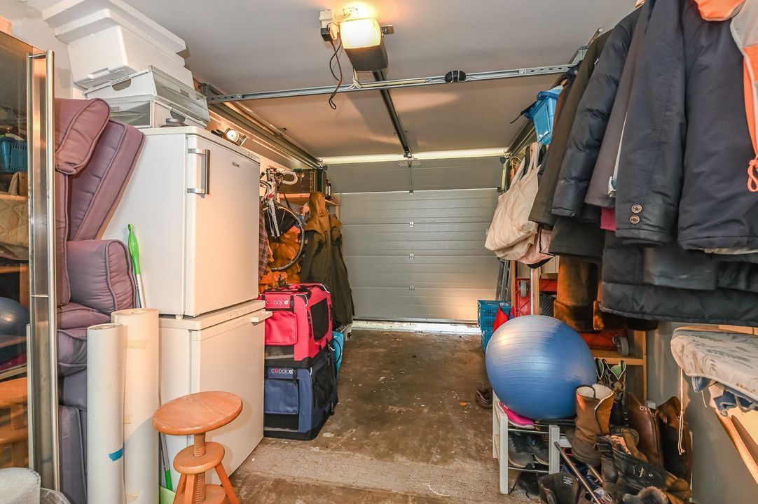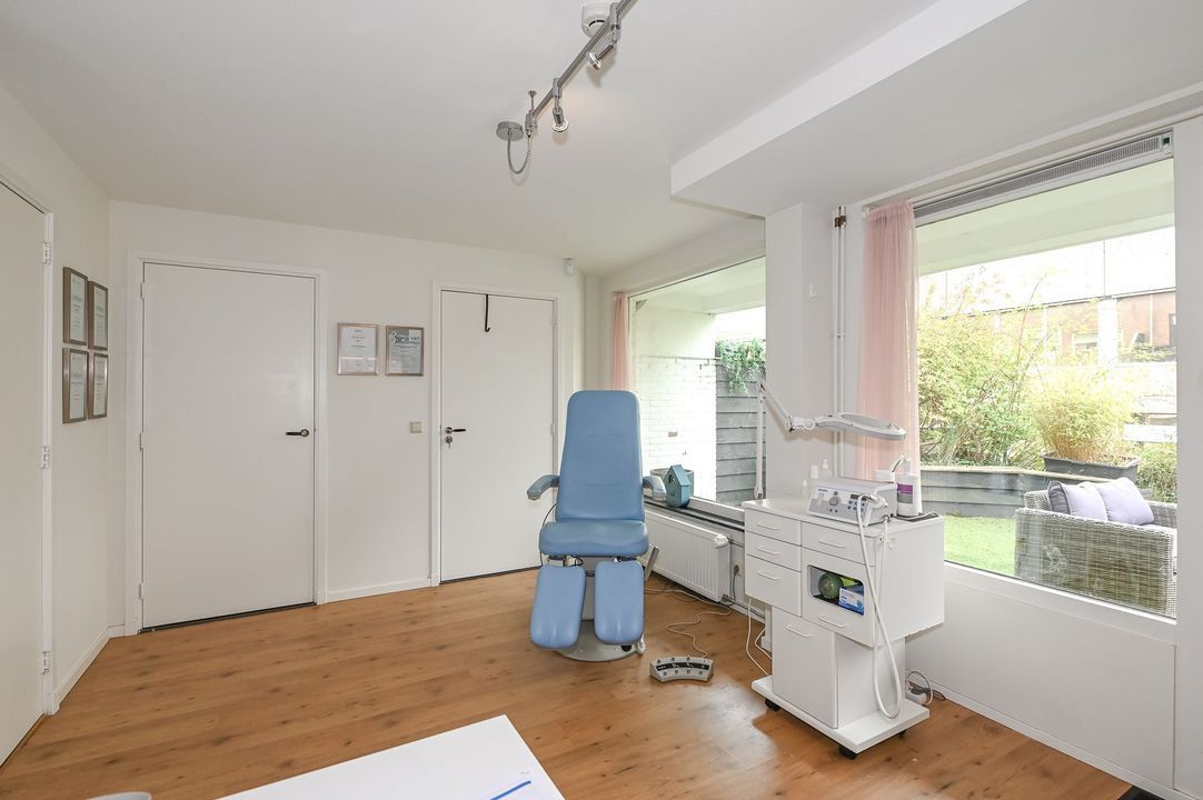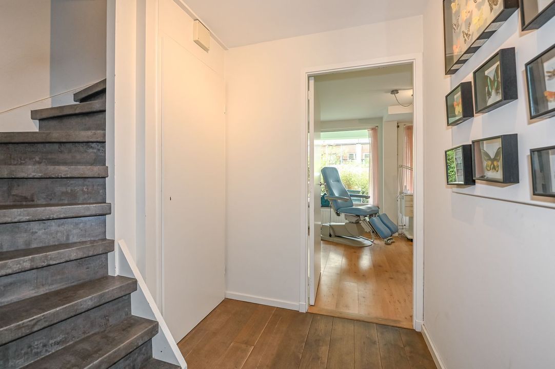 Indeling: oprit/voortuin, elektrische garagedeur naar inpandige garage(19,3 m2) met doorgang naar entree/hal met garderobe, uitgebreide meterkast en wc, trapkast, achterkamer is thans "praktijk aan huis" met opstelling wasmachine droger, wastafel/kitchenette en doorgang naar kleine achtertuin (N-W). De begane grond laat zich gemakkelijk ombouwen tot extra woonruimte.