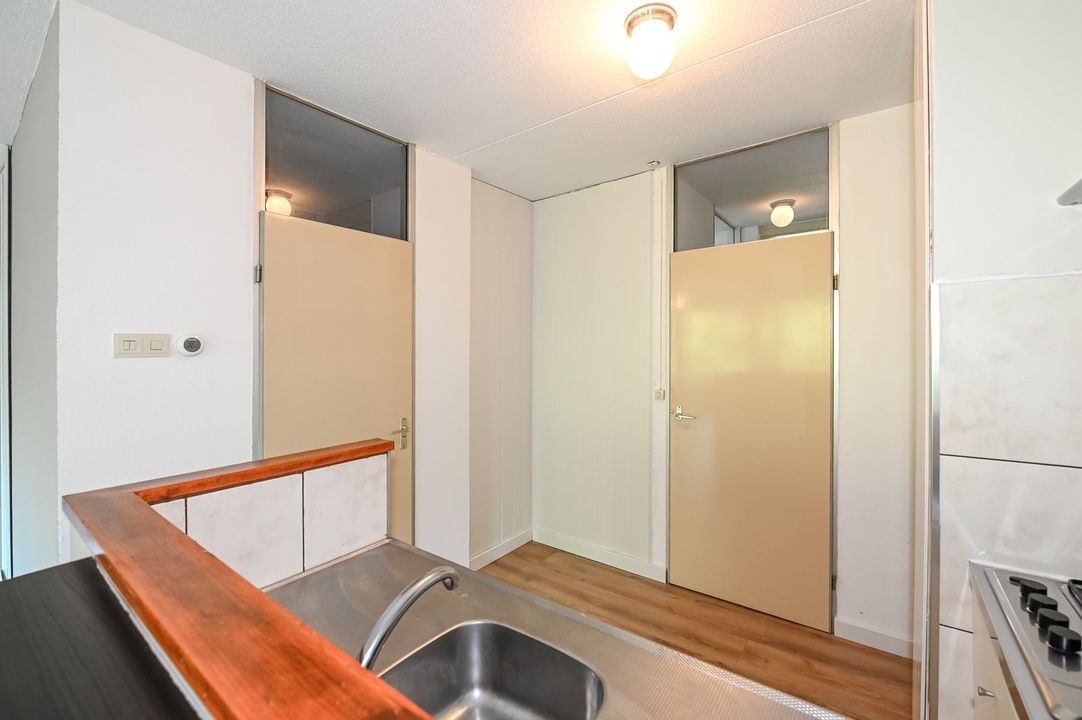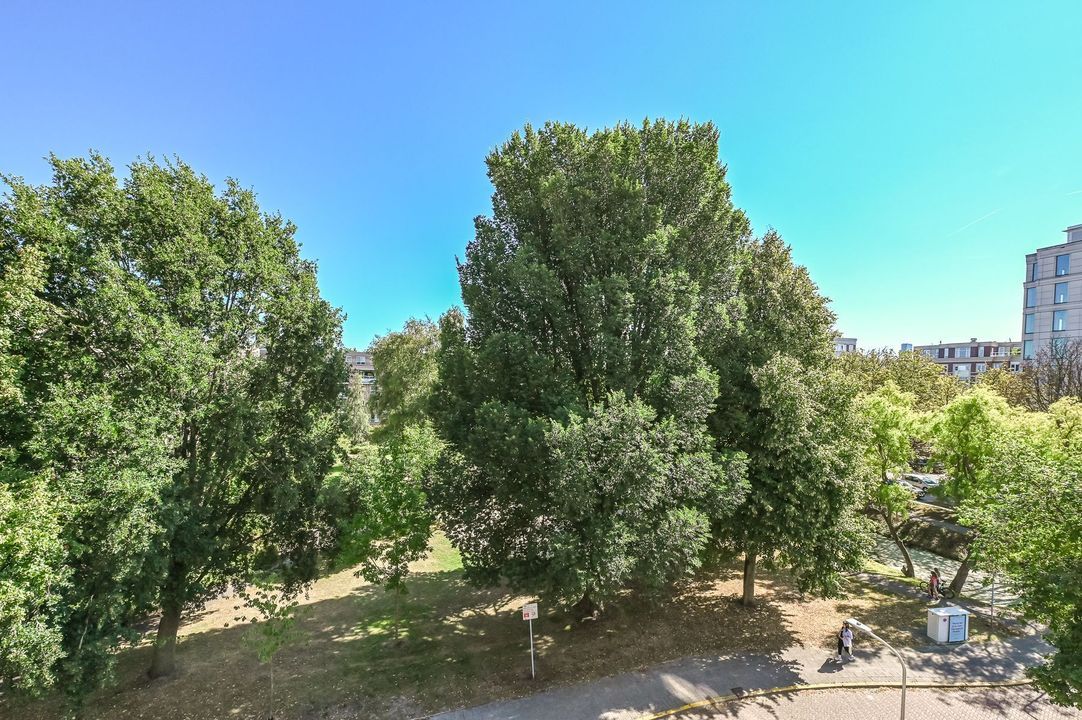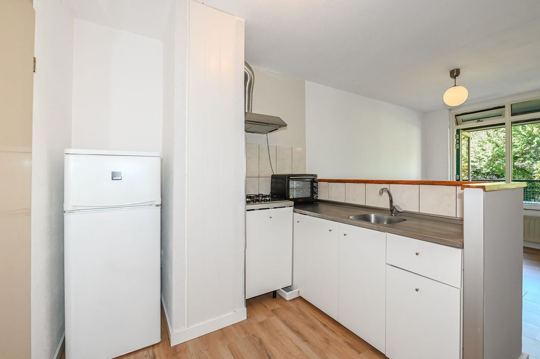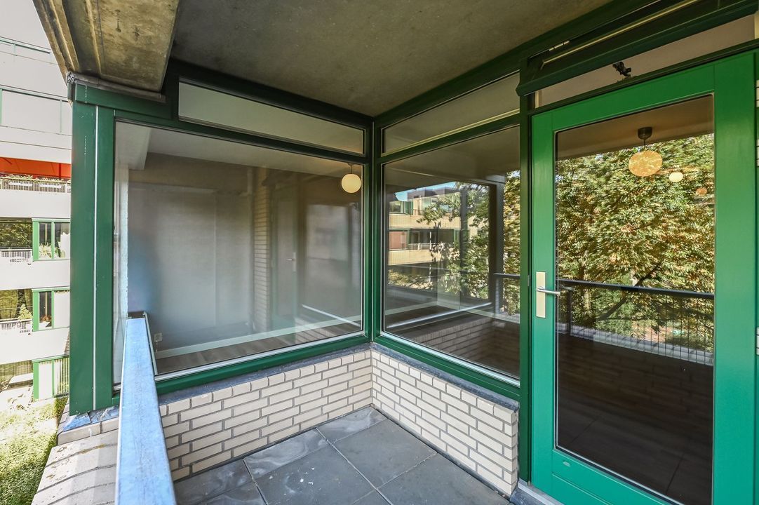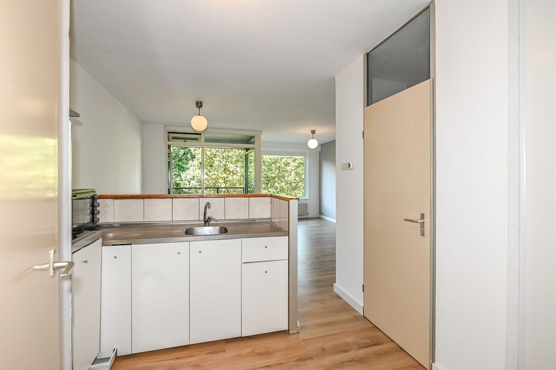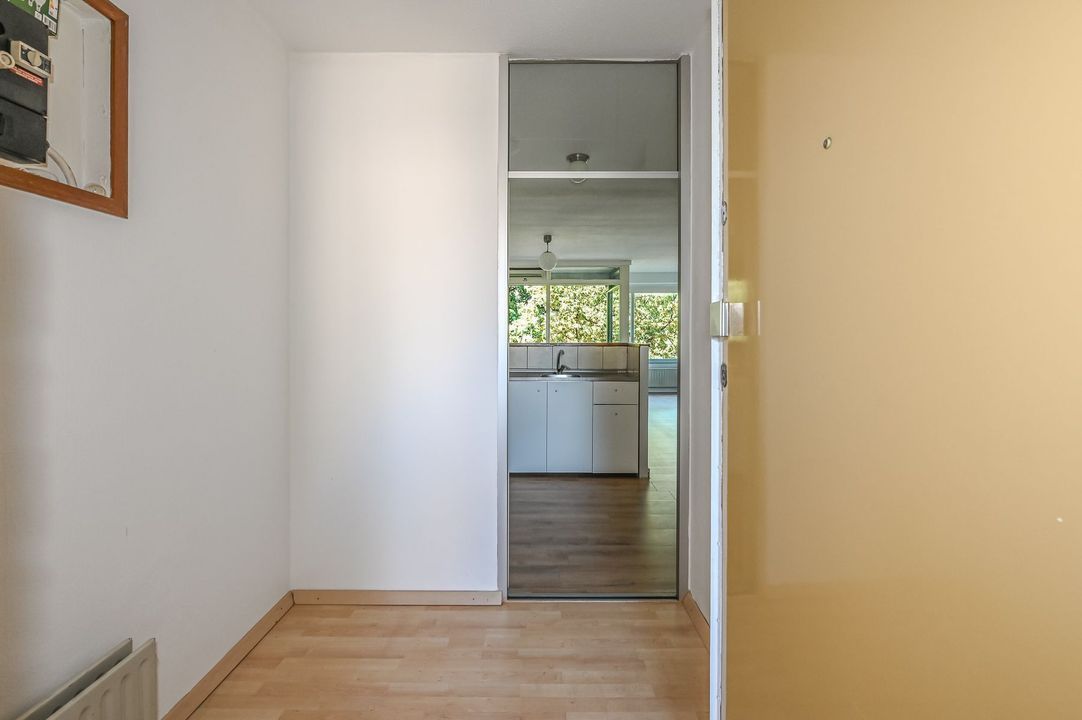 Algemene entree, lift naar 3e verdieping, galerij/trap naar app. entree: hal, meterkast, garderobe, ruime woon-/eetkamer met open keuken in L-vorm, deur naar zonnig balkon(Zuid-West) met groen uitzicht, ruime slaapkamer, nette badkamer met ligbad, wastafel en wc. Privé berging(3.12x2.58) en alg. fietsenberging in onderbouw
