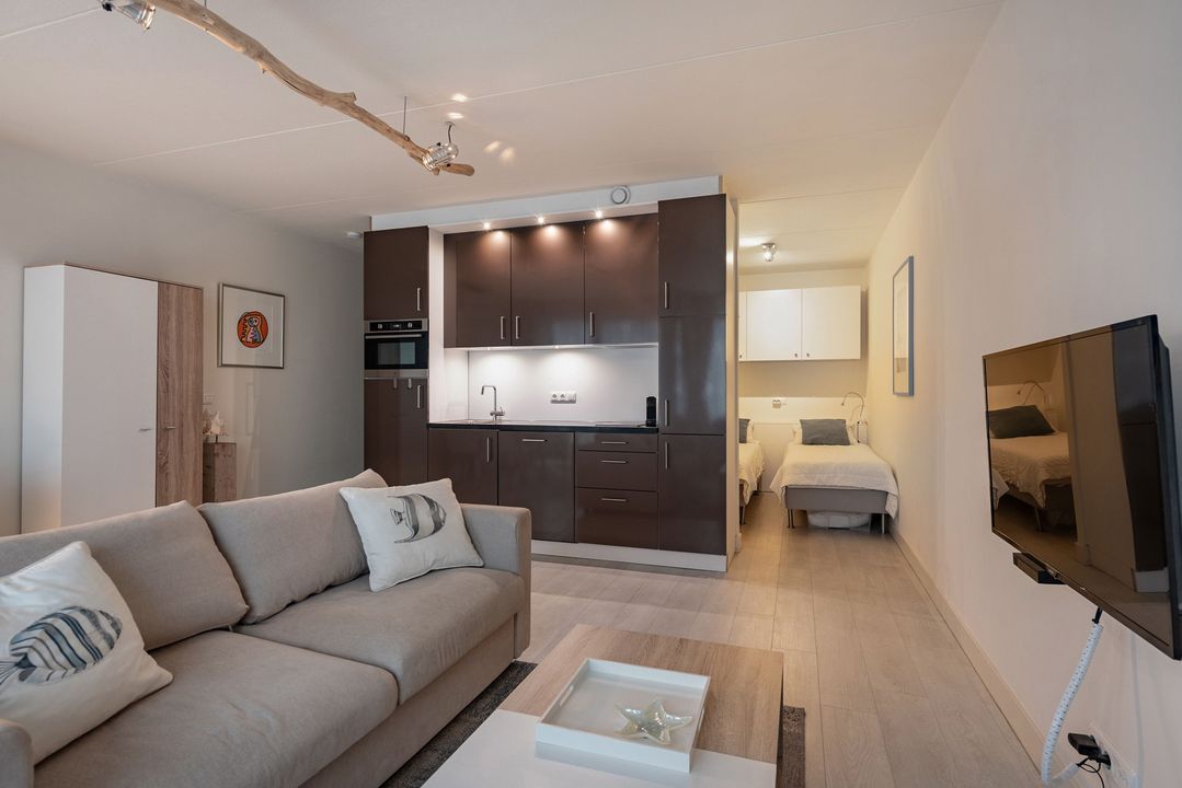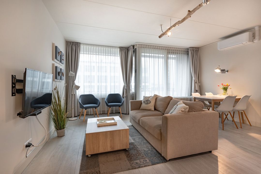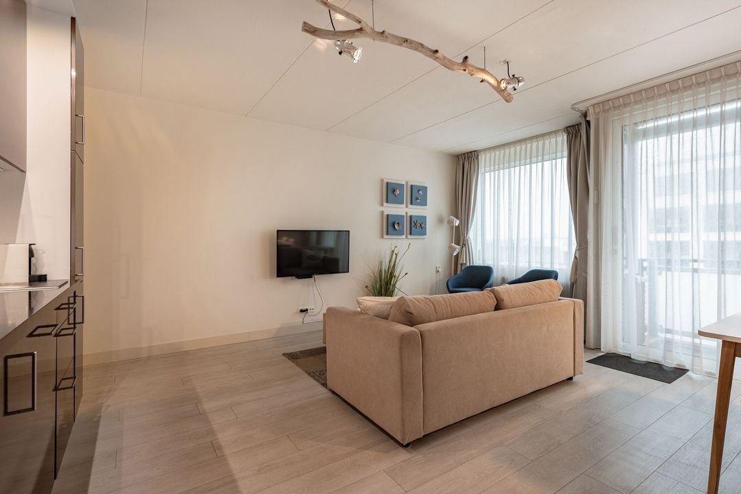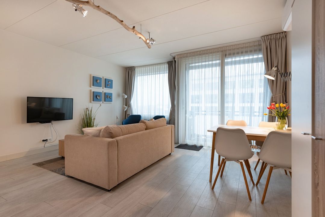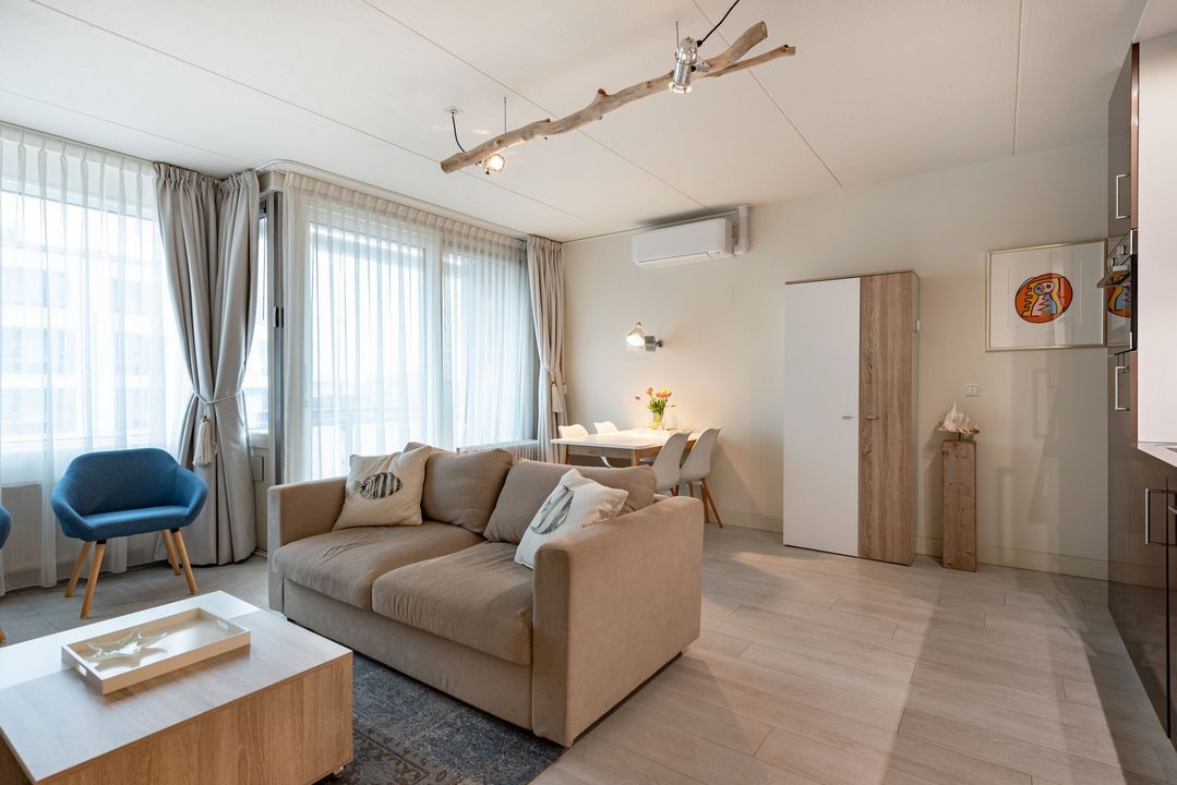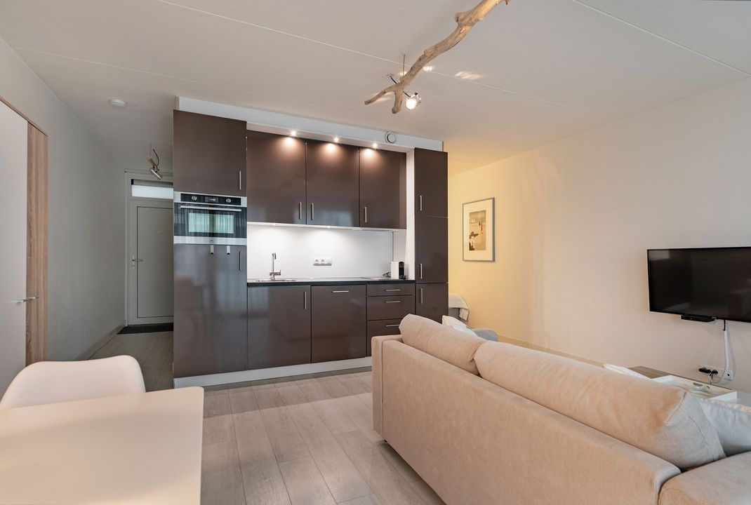 Living/dining met geintegreerde luxe open keuken voorzien van diverse inbouwapparatuur en schuifpui naar zonnig balkon. Vanuit de living doorloop naar slaapgedeelte.