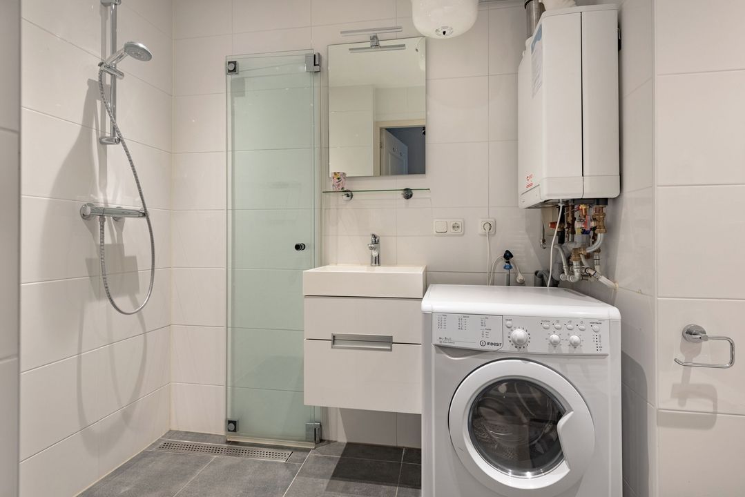 Gezamenlijke entree met video-systeem ; lift en trappenhuis naar de 4e etage ; entree appartement ; hal met intercom, meterkast en toegangsdeur naar moderne badkamer met royale inloop-douche, vaste wastafel met meubel, toilet, handdoekenradiator en aansluiting wasmachine .