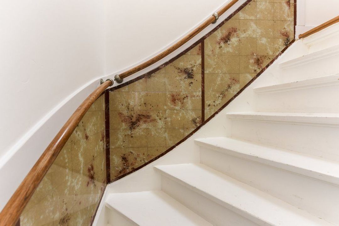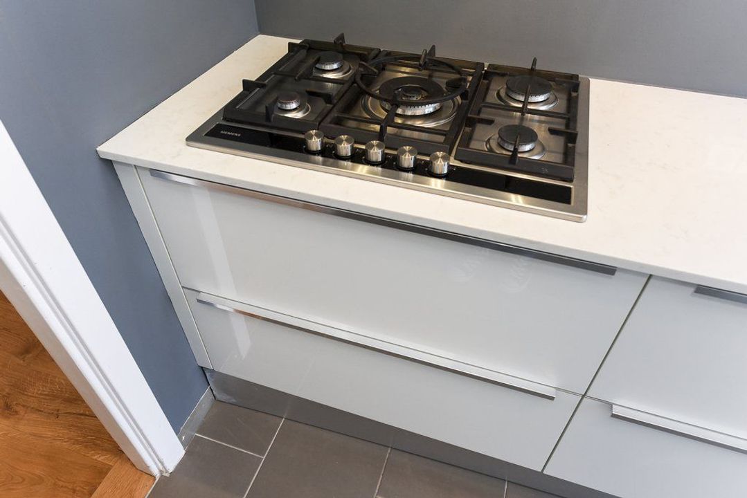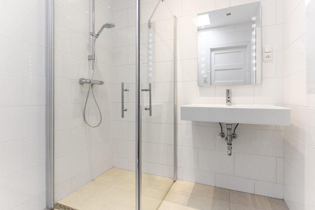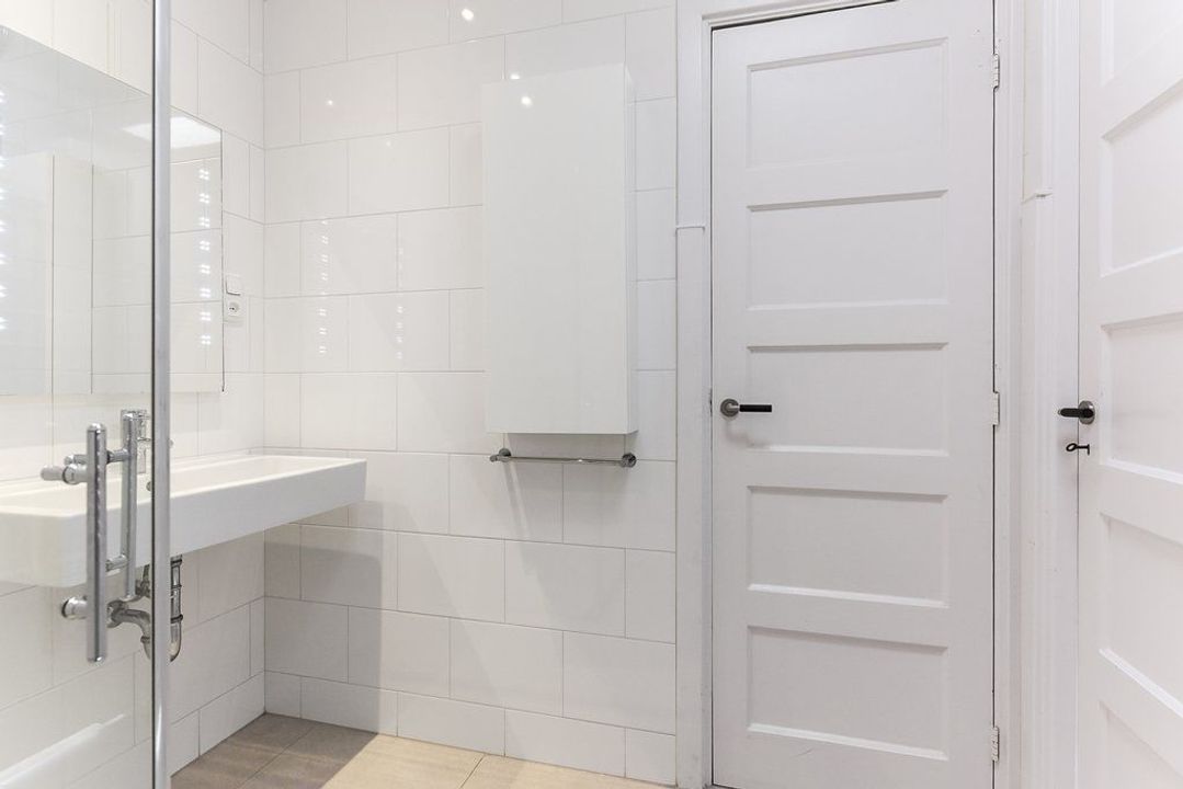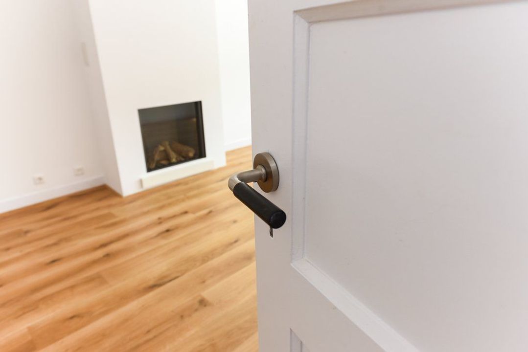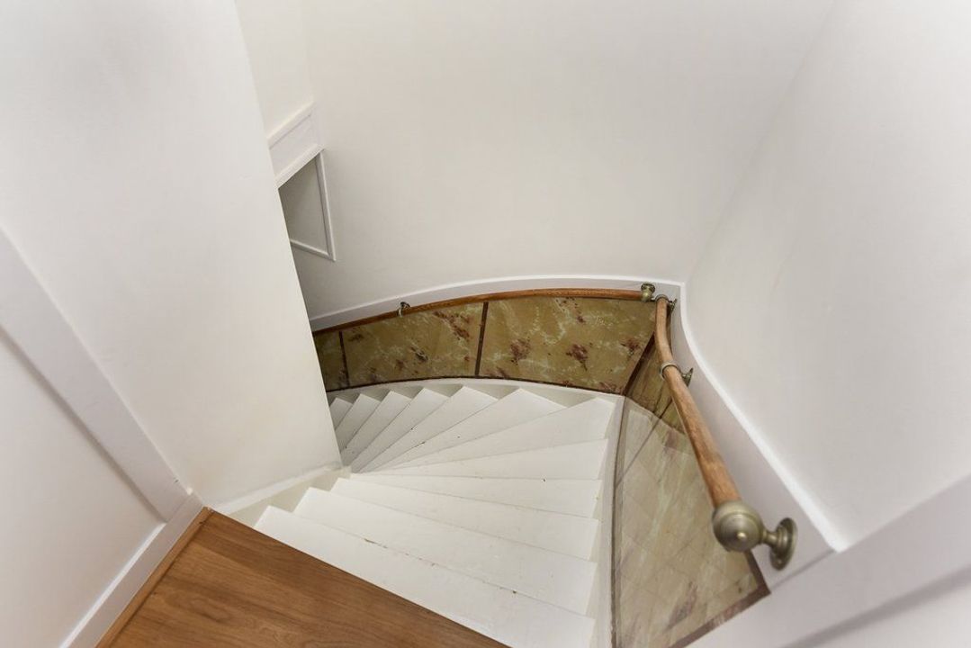 Ruime entree op de eerste verdieping, trap naar de tweede verdieping, overloop met vaste kast met wasmachine en droger, modern toilet, lichte woon-eetkamer ensuite met houten vloeren, balkon aan de achterzijde (W), moderne keuken met inbouwapparatuur (Siemens), hoofdslaapkamer aan de voorzijde met houten vloeren, aangrenzende badkamer, slaapkamer aan de overzijde met houten vloeren.