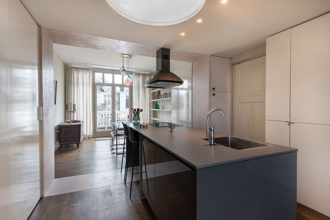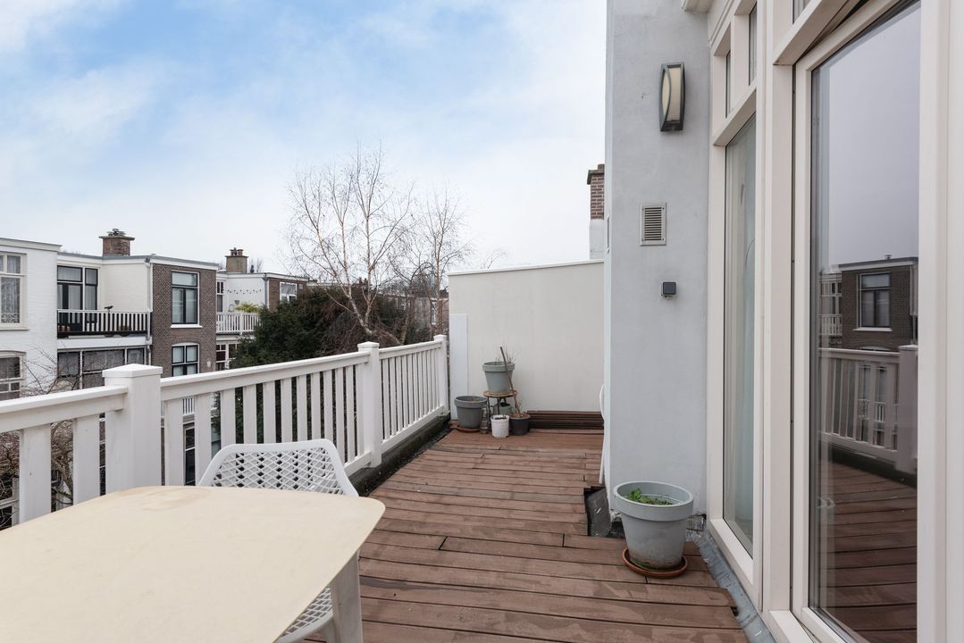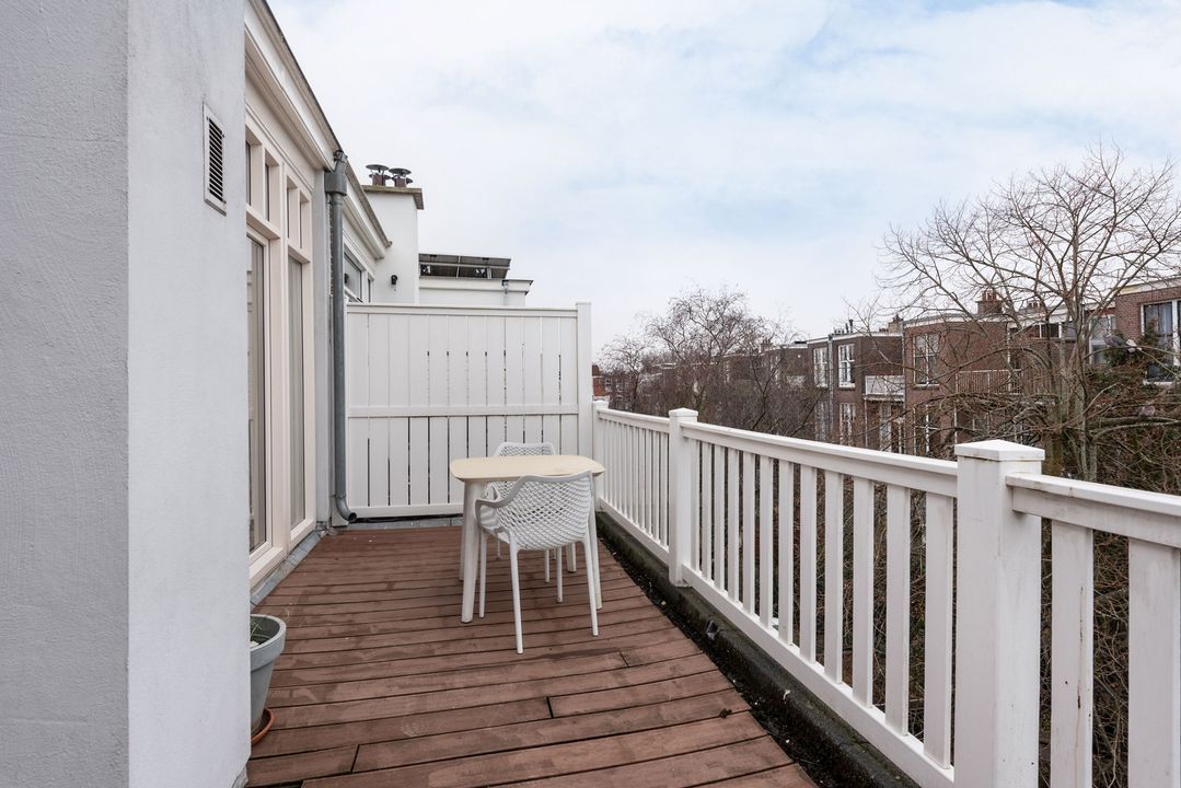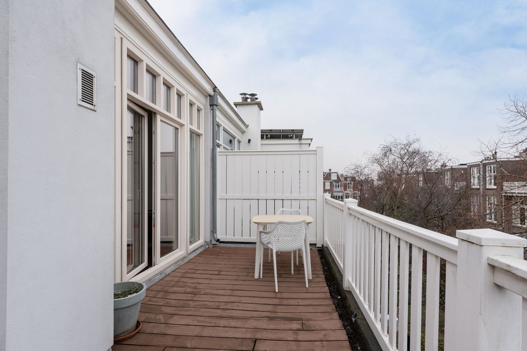 Het appartement is gelegen op de tweede (top) etage in een voormalig herenhuis met hoge plafonds en een royaal ( 15m2) achterbalkon over de volle breedte.
