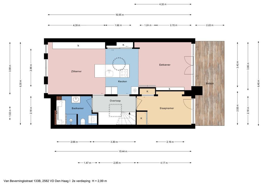 Gezamenlijke entree op de begane grond , trap naar de 1e etage ; overloop met entree appartement met binnentrap naar de tweede etage met overloop ; zeer royale living/dining ( ca.45 m2) met een geïntegreerd kookeiland voorzien van diverse inbouw-apparatuur ; tevens bevindt zich er een ingenieus bedacht uittrekbaar dubbelbed met 2 extra slaapplaatsen ; bovendien ook nog veel kastruimte. Achterslaapkamer met vaste kast en toegangsdeur naar het balkon ; moderne badkamer met ligbad, aparte douche, waskom, toilet en wasmachine aansluiting.