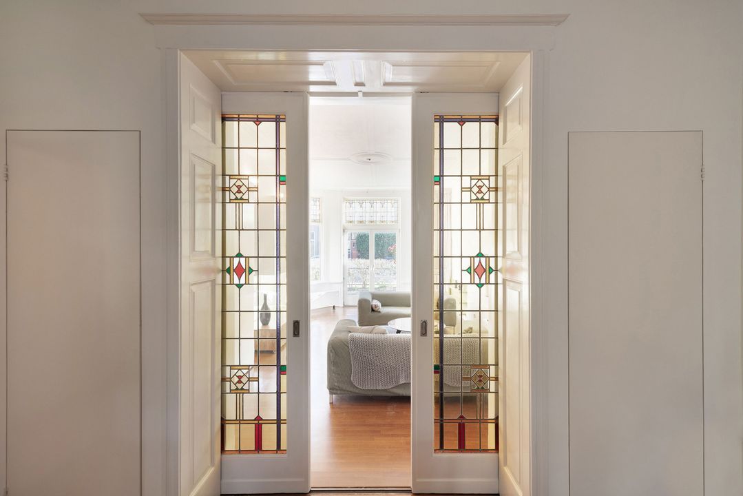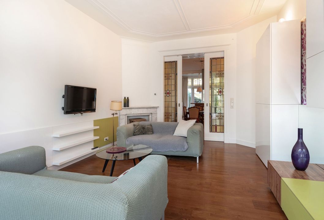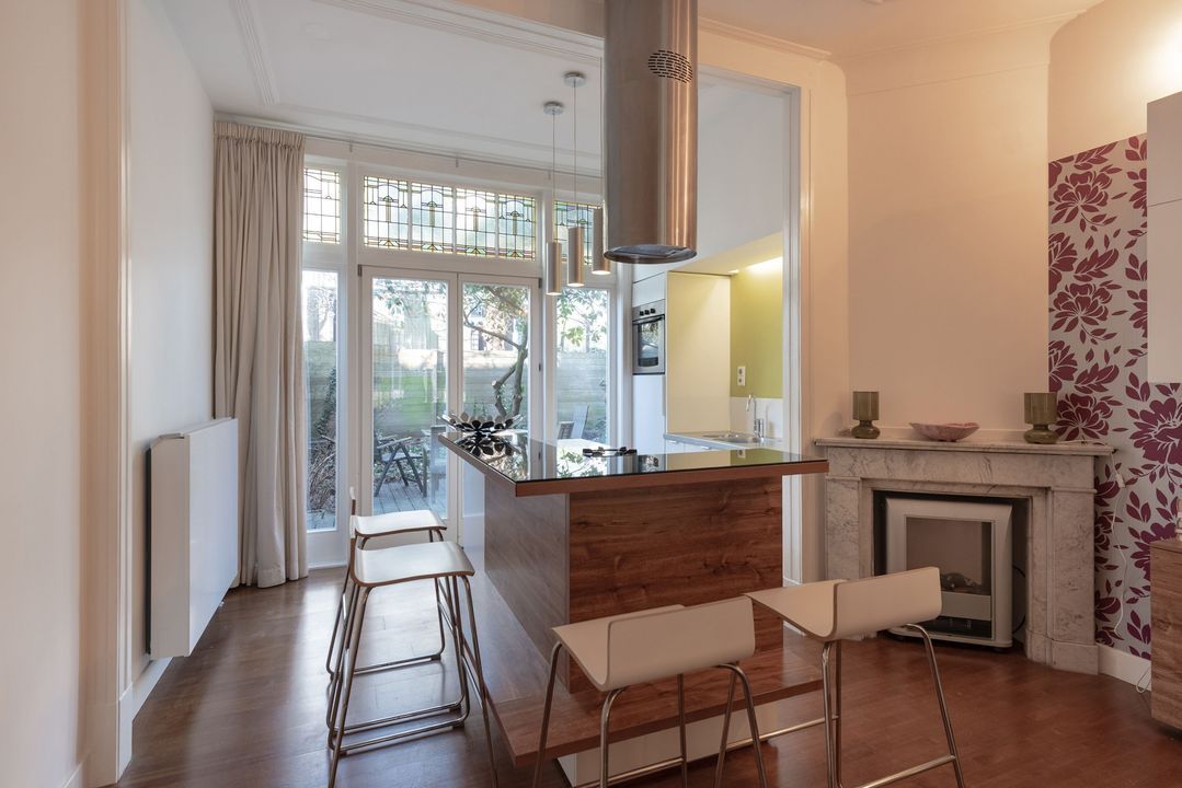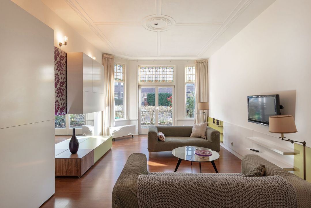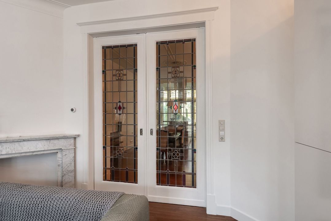 Het appartement is gelegen in een voormalig herenhuis met hoge, originele plafonds, een schuifseparatie met glas-in-lood roedeverdeling, paneeldeuren, 2 marmeren schouwen en geheel voorzien van dubbele beglazing.