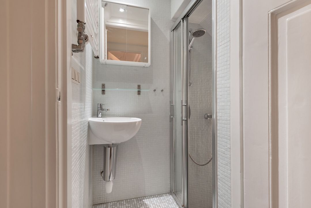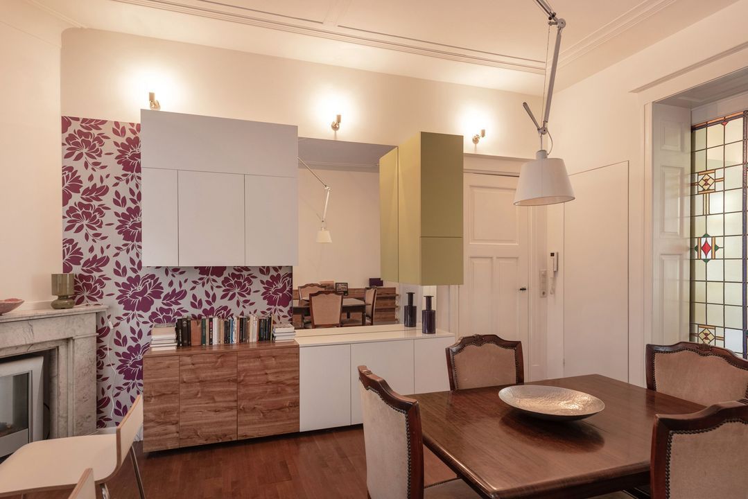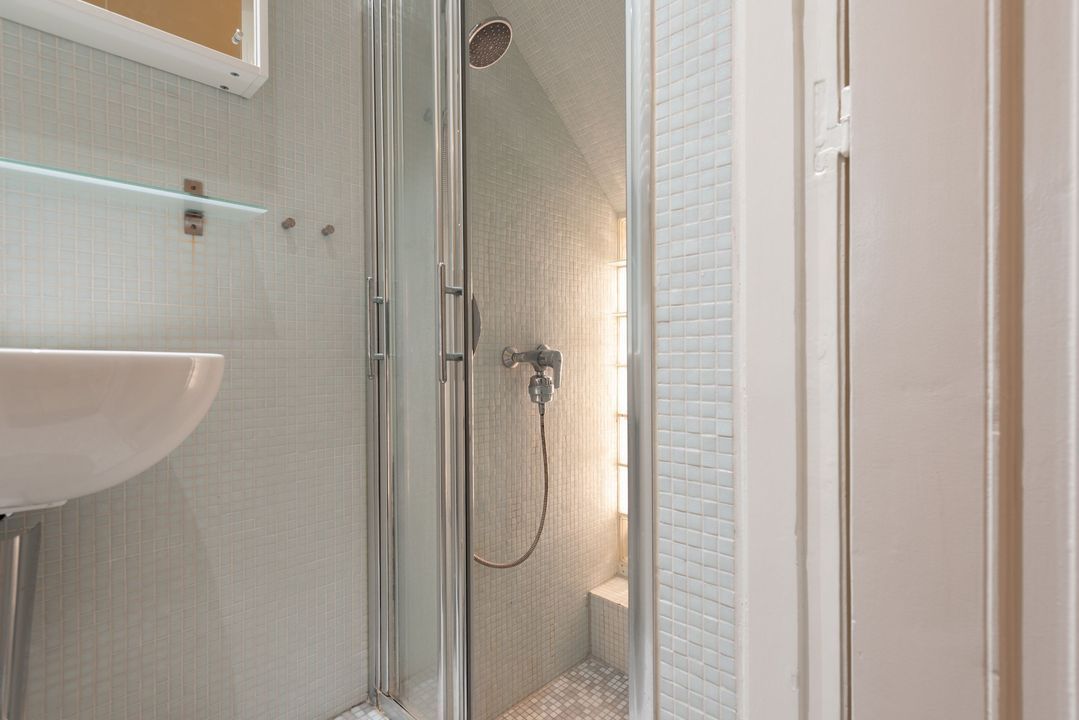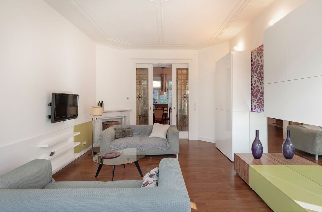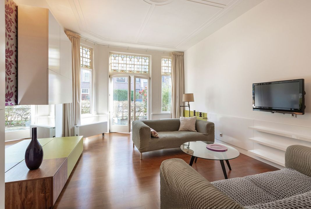 Het appartement is gelegen in een voormalig herenhuis met hoge, originele plafonds, een schuifseparatie met glas-in-lood roedeverdeling, paneeldeuren, 2 marmeren schouwen en geheel voorzien van dubbele beglazing.