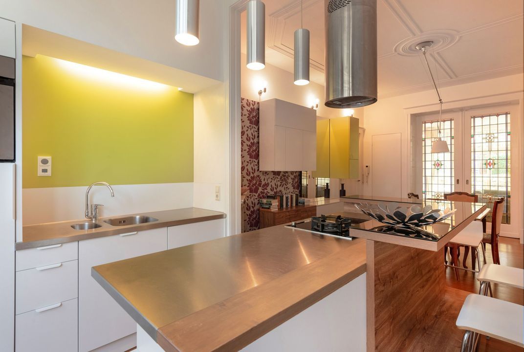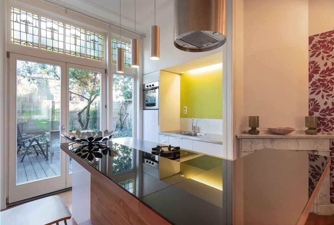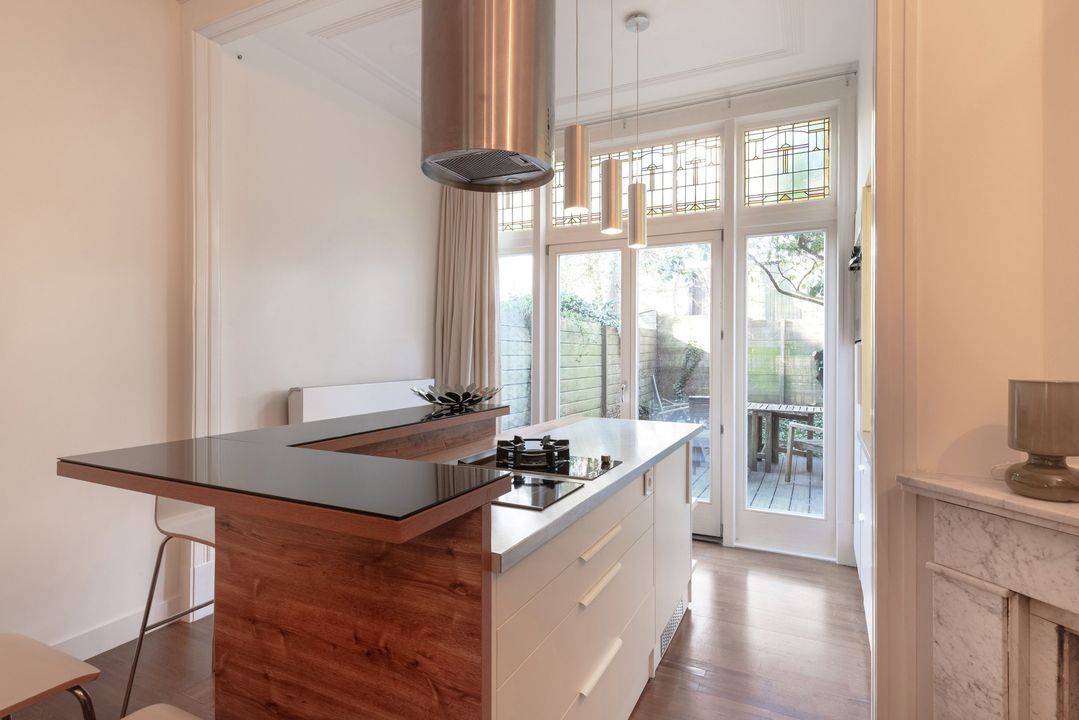 Riante kamer ensuite ( ca. 14 x 4 m) voorzien van prachtige parketvloeren met aan de achterzijde een geïntegreerde keuken met kookeiland met diverse inbouwapparatuur en openslaande deuren naar de heerlijke achtertuin op het Zuid-Westen.