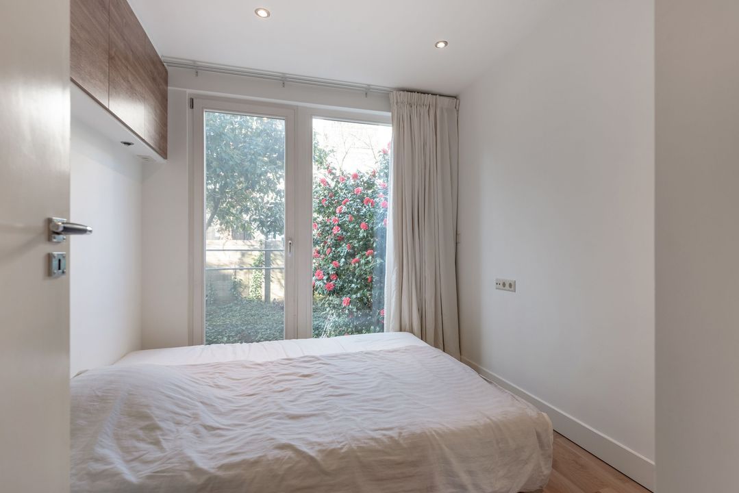 Achter(zij)slaapkamer met ingebouwde kasten en toegangsdeur naar de tuin.