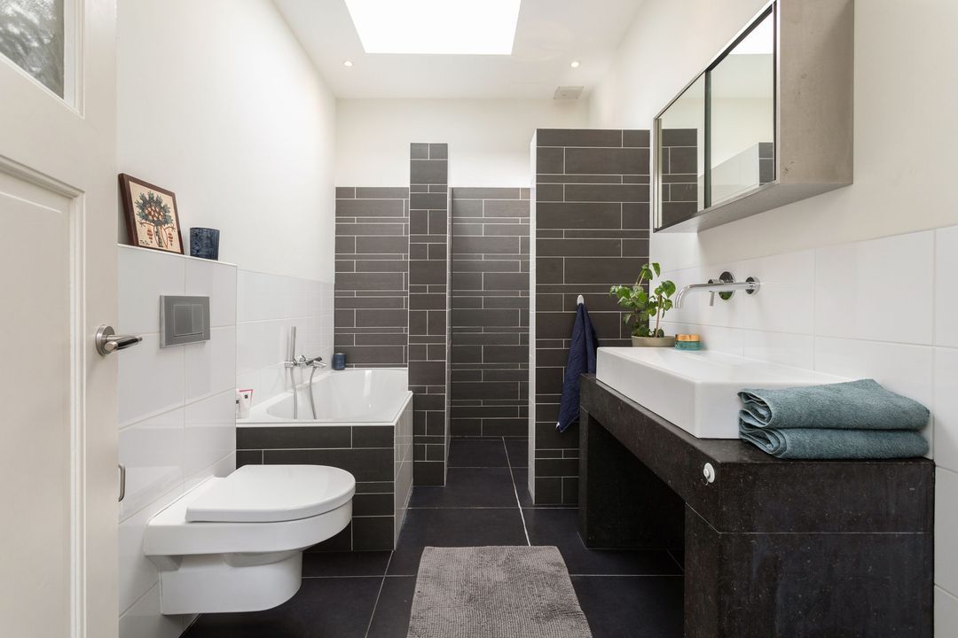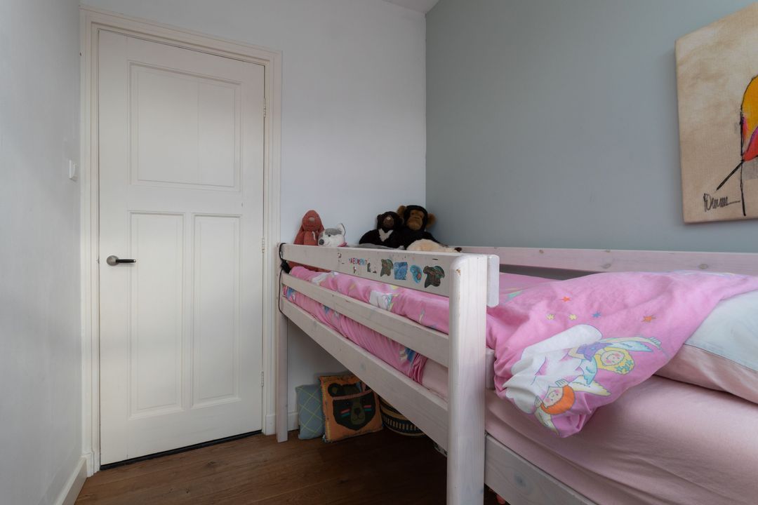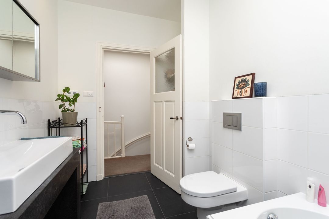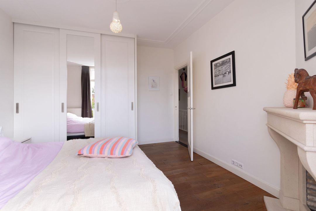Trap naar de eerste verdieping: overloop met kast met opstelplaats wasmachine/droger, grote slaapkamer aan de voorzijde met houten vloer, zijkamer aan de voorzijde met houten vloer en toegang (via vlizotrap) tot de ruime bevloerde vliering van ca. 15m2 met opstelplaats c.v. ketel, ruime en moderne tussengelegen hoogwaardige en complete badkamer v.v. vloerverwarming, ligbad, inloopdouche met hand- en regendouche, wastafelmeubel en wc, mooi formaat hoofdslaapkamer aan de achterzijde met houten vloer, vaste kast, schouw met open haard (gas) en toegang tot balkon over de volle breedte aan de achterzijde, zijkamer achterzijde v.v. houten vloer.