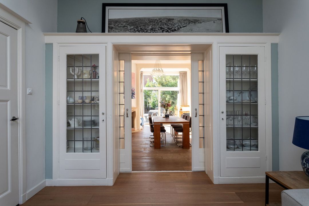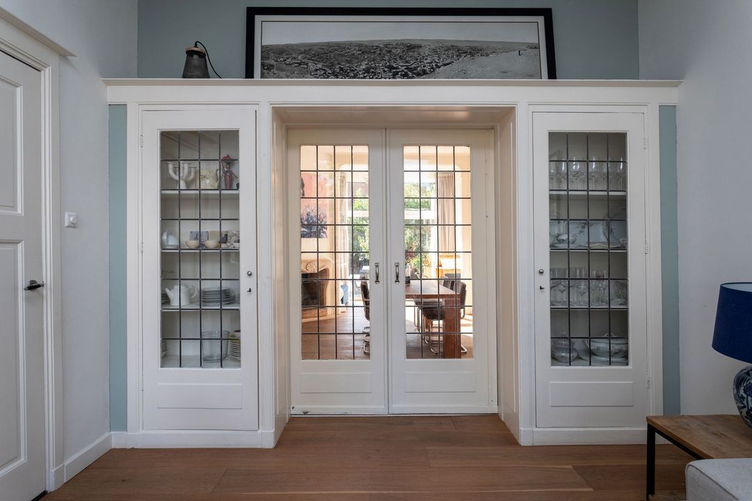 Indeling: entree met granito vloer, wandtegels en meterkast, tochtdeur naar gang eveneens met granito vloer, trapkast, modern toilet, sfeervolle woon- eetkamer ensuite v.v. lijsten plafonds, glas-in-lood suiteseparatie met aan weerszijden kasten, houten vloeren, schouw met open haard en toegang tot de achtertuin, dichte moderne en luxe keuken (Siematic) v.v. diverse (inbouw)apparatuur w.o. inductie kookplaat, combi-magnetron ijskast /vriezer, koffie machine, afwasmachine en afzuigkap, toegang tot de achtertuin.