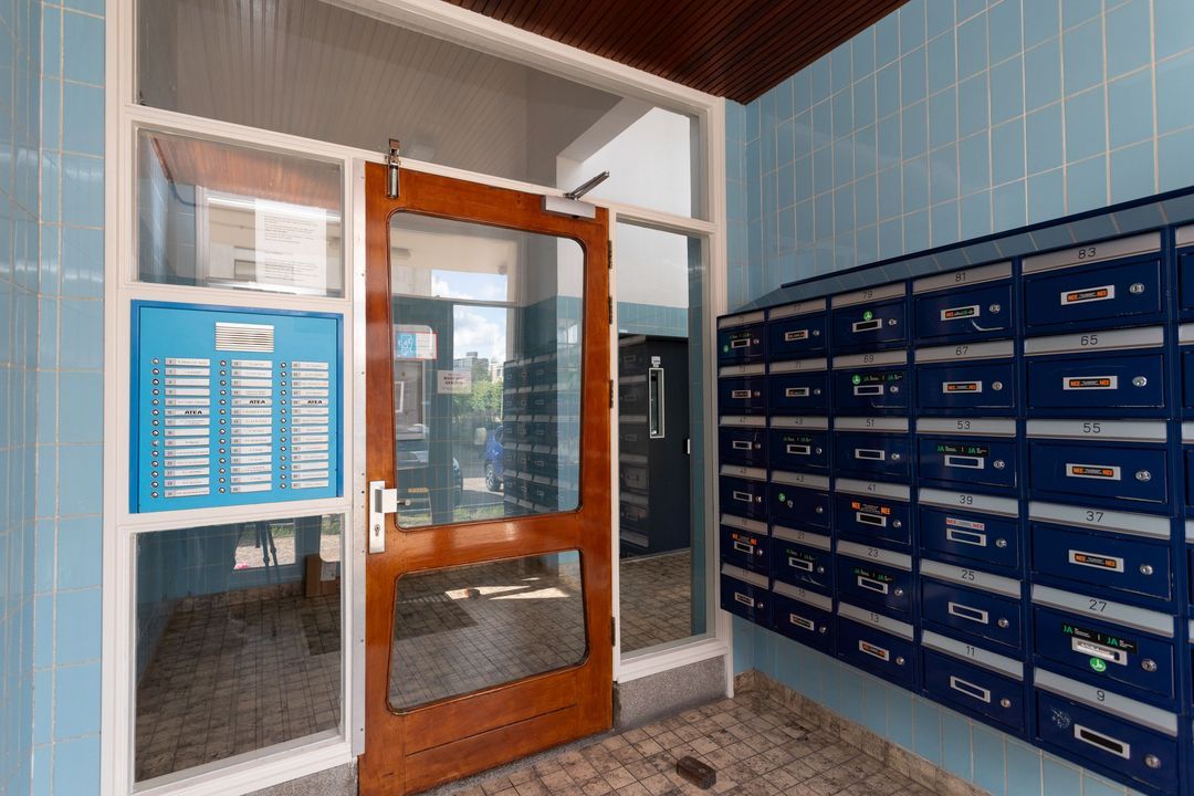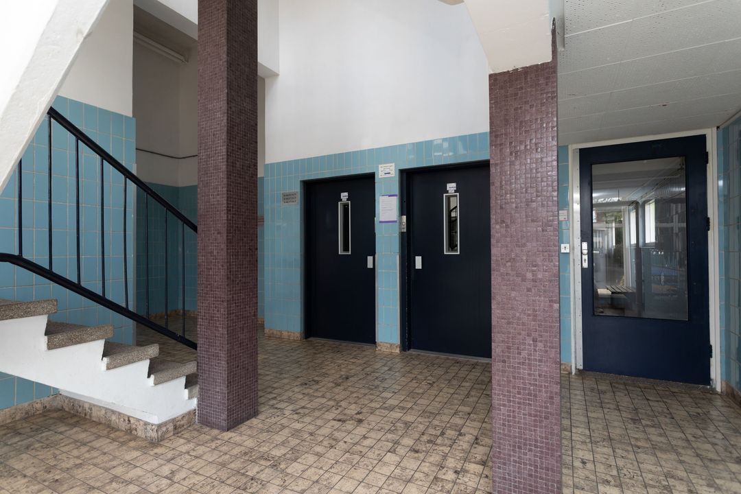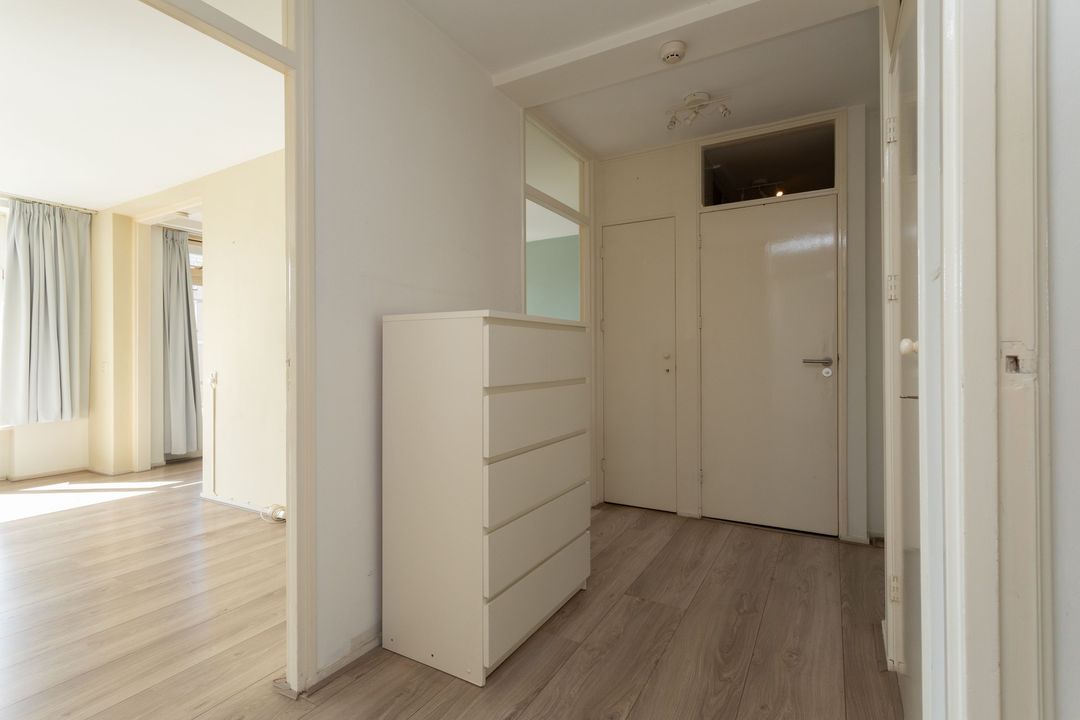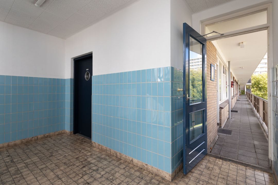 Gesloten portiek met brievenbussen- en bellentableau,trappenhuis en lift naar de 4e etage ; via de galerij komt u bij de entree van het appartement ; tochthal naar L-vormige gang met 2 bergkasten, de meterkast en gemoderniseerd toilet + fonteintje.