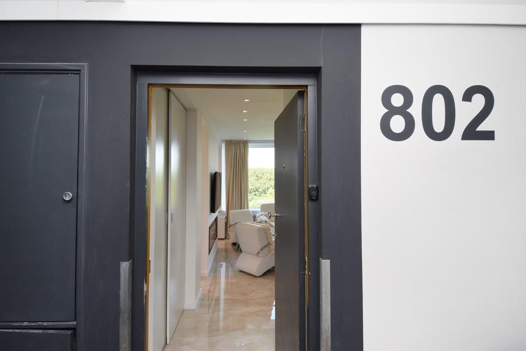 Indeling: gesloten centrale entree met kantoor voor de huismeester en gemeenschappelijke ruimte, lift of trap naar de 8e verdieping, entree appartement, vaste kastenwand met schuifdeur en wasmachine opstelplaats, videofoon, "hal", schitterende living met elektrische open haard, luxueuze open keuken in L-vorm geplaatst met breakfast bar en voorzien van diverse inbouwapparatuur, een fraai scheidingswand tussen de living en hoofdslaapkamer, vanuit de hoofdslaapkamer heeft men toegang tot het balkon (NO) met mooi uitzicht, grenzend aan de hoofdslaapkamer heeft men een luxueuze badkamer met ruime inloop douche met drain en rainshower, wastafelmeubel, vrij hangend toilet, mechanische ventilatie en inbouwverlichting.